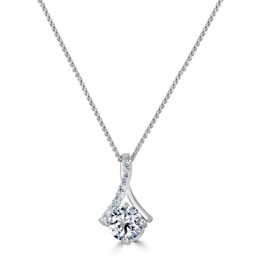 A stunning 18ct white gold diamond pendant, a masterpiece of craftsmanship and elegance. This exquisite pendant features a mesmerizing 1.97ct round brilliant cut diamond, securely held in a four-claw setting. The diamond, with its radiant, assessed H/I colour and superb VVS2/VS1 clarity, is the focal point of this elegant piece, designed to capture and reflect light from every angle. Adding to the pendant's allure is the half diamond set crossover style mount. This unique design element encases the central diamond in a sweeping embrace, adorned with additional diamonds totalling 0.19ct. These diamonds add an extra layer of sparkle and sophistication, enhancing the pendant's overall brilliance. The pendant gracefully hangs from an 18ct white gold 16-inch Spiga chain, known for its durability and intricate weave pattern. This choice of chain complements the pendant's luxurious feel, making it a perfect piece for special occasions or as a statement piece in your jewellery collection.