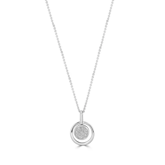 Adorn yourself with the refined elegance of this 18ct white gold pendant, featuring a dazzling diamond set inner circle gracefully suspended within a sleek, plain outer circle. The pendant is beautifully showcased on an 18ct white gold trace chain, adjustable from 18 inches to 17 inches, offering versatility and comfort. With a total diamond weight of 0.19ct, this pendant exudes a subtle yet captivating sparkle, perfect for adding a touch of sophistication to any outfit. The harmonious design of the inner and outer circles symbolizes unity and balance, making it a meaningful addition to your jewellery collection. Whether for everyday wear or special occasions, this pendant is a timeless piece that enhances your elegance and style.