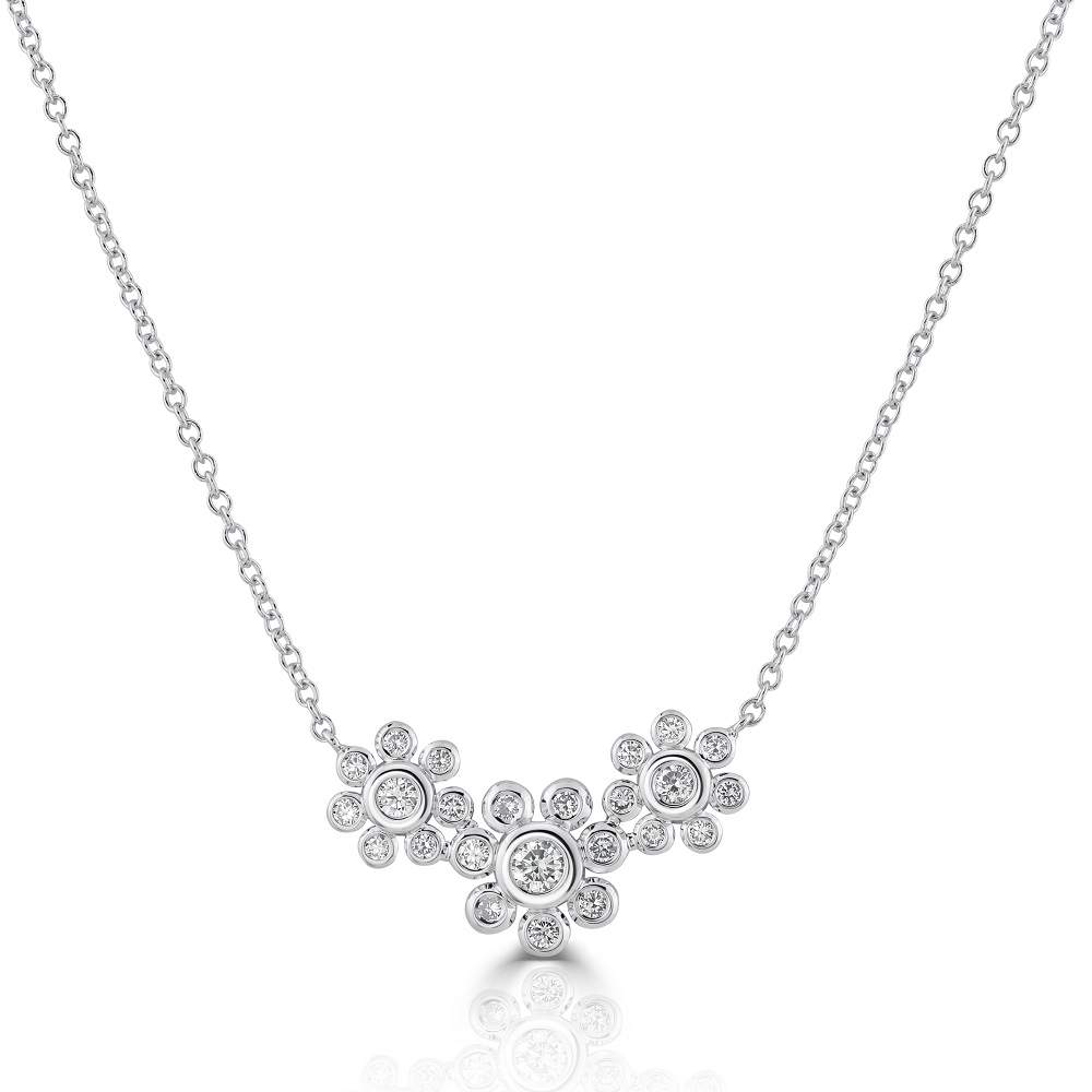 Embrace the delicate beauty of our 18ct white gold triple flower shaped pendant, a stunning addition to any fine jewellery collection. This exquisite pendant features three flower motifs, each centred with a single rubover set round brilliant cut diamond, surrounded by seven additional diamonds forming the petals. The elegant design boasts a total diamond weight of 0.90 carats, ensuring each piece sparkles with clarity and brilliance. Suspended from an 18-inch adjustable white gold trace chain, which includes two additional rubover set diamonds for an extra touch of glamour, this pendant adjusts easily to 17 inches for versatile styling. Crafted in lustrous 18ct white gold, this pendant captures the essence of sophistication and charm, making it perfect for special occasions or as a standout addition to your everyday wardrobe. Elevate your look with this breathtakingly beautiful diamond pendant, designed to draw attention and admiration wherever you go.