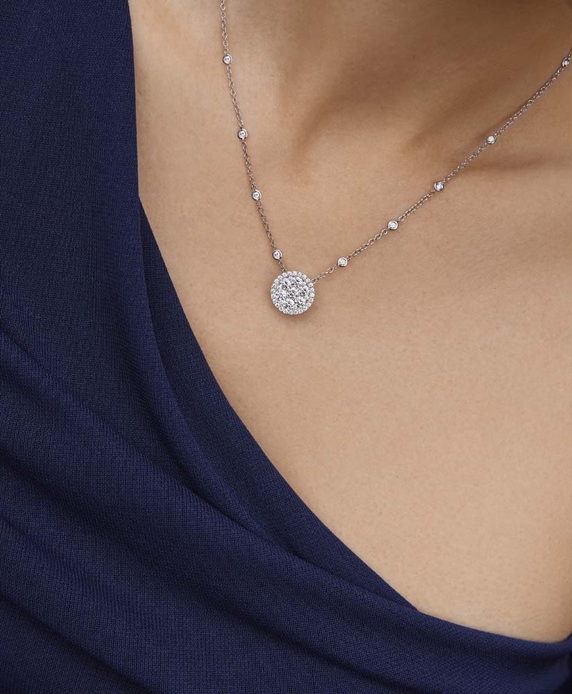 An exquisite 18ct white gold slider pendant, a masterpiece of fine jewellery that showcases intricate craftsmanship and luxurious design. This stunning pendant features a central circle, beautifully set with seven central round brilliant cut diamonds, complemented by six smaller diamonds that elegantly fill the gaps, creating a seamless sparkle. A dazzling halo of additional diamonds encircles this arrangement, enhancing the pendant's overall brilliance. Furthermore, the pendant is suspended from a sophisticated 16-inch white gold trace chain, which itself is rubover set with twelve scattered round brilliant cut diamonds, adding a touch of glamour with every movement. With a total diamond weight of 0.72 carats, this pendant is a perfect blend of elegance and style, making it an ideal choice for special occasions or as a significant gift for someone truly special in your life. Elevate your jewellery collection with this radiant and meticulously designed diamond pendant, a symbol of luxury and timeless beauty.