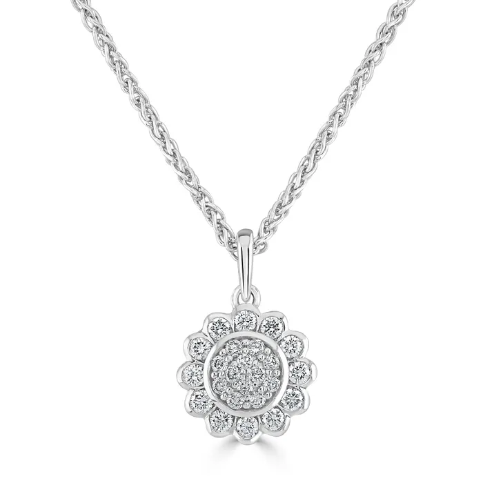Introducing our 18ct white gold cluster pendant, beautifully crafted into a charming flower shape and adorned with round brilliant cut diamonds. Set on an elegant 18-inch 18ct white gold Spiga chain, this pendant sparkles with a total diamond weight of 0.27ct, making it a dazzling addition to any attire. Each diamond is meticulously arranged to mimic the natural grace of a flower, offering a blend of sophistication and timeless beauty. Perfect for special occasions or as a standout piece in your everyday collection, this floral diamond pendant is a testament to classic elegance and luxurious design.