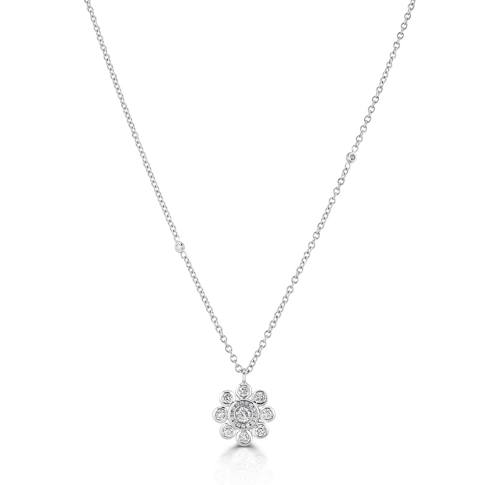 A gorgeous 18ct white gold flower shaped pendant with a single sparkling round brilliant cut diamond at the centre and seven further round brilliant cut diamonds for petals. All suspended from an 18ct white gold 18 inch (adjustable to 17 inch) trace chain which is also set with two twinkling diamonds. Other variations are available, please contact the store for more details.