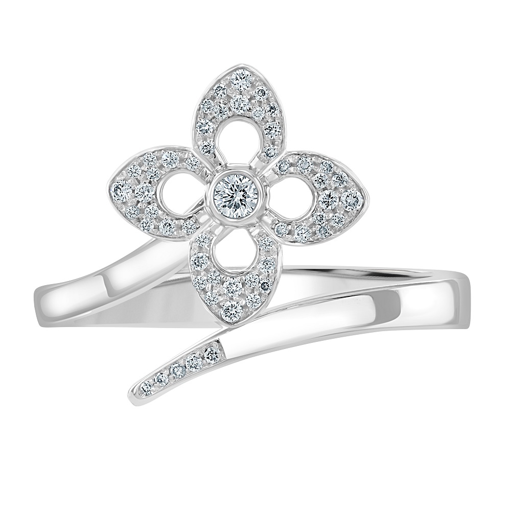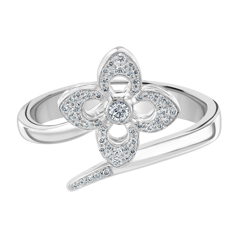 An enchanting 18ct white gold open flower style crossover cluster ring is a stunning creation that epitomizes the essence of spring and renewal. This exquisite ring features a unique open flower design, expertly crafted with a centre rubover set round brilliant cut diamond. This central gem is beautifully surrounded by smaller round brilliant cut diamonds, grain set to form four delicate petals, symbolizing growth and new beginnings. At the other end of the crossover design, more grain-set round brilliant cut diamonds add an extra layer of sparkle, enhancing the ring's intricate detailing and overall allure. Crafted from luxurious 18ct white gold, this ring combines strength and elegance, providing a durable and stylish setting that complements the brilliance of the diamonds perfectly. This piece is inspired by the beauty and vitality of spring, making it an ideal gift for commemorating significant life events such as engagements, anniversaries, or personal milestones.