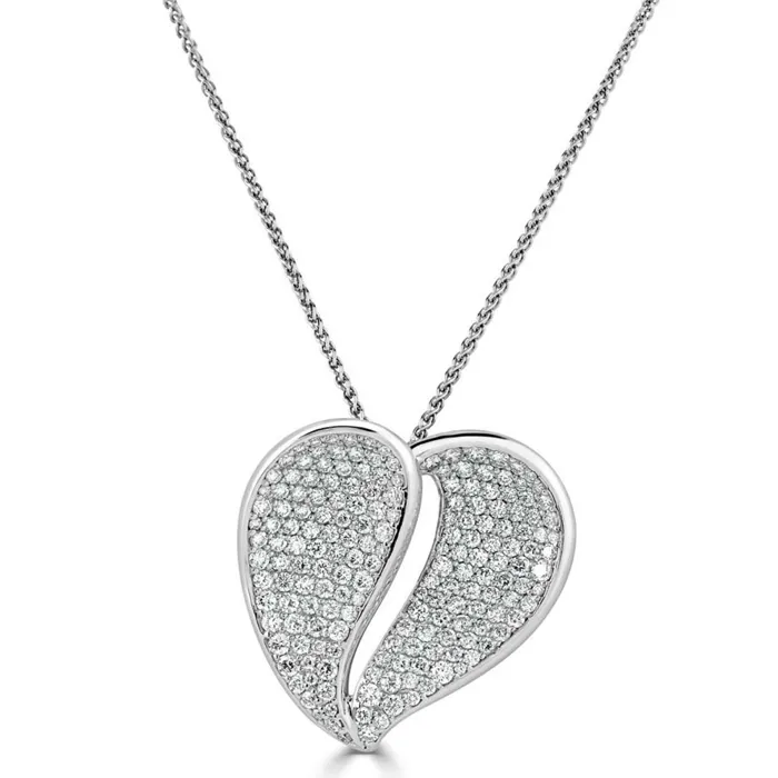 Indulge in the luxury of our 18ct white gold heart pendant, a stunning showcase of love and brilliance. This exquisite pendant is beautifully pavé-set with round brilliant cut diamonds, totalling an impressive 2.50 carats, ensuring a radiant display of shimmer from every angle. The heart shape, a timeless symbol of affection and romance, is expertly crafted in 18ct white gold, adding a touch of elegance and purity to this captivating piece. Suspended from an 18-inch spiga chain also crafted in 18ct white gold, this pendant sits perfectly at the collarbone, making it an ideal accessory for both everyday elegance and special occasions. Whether as a gift for a loved one or a treat for yourself, this heart pendant is sure to enchant and delight any recipient.