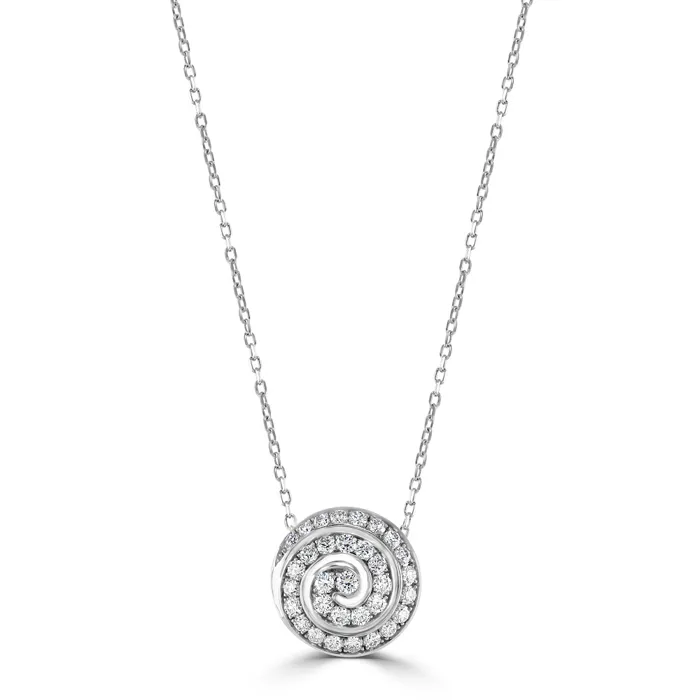 Our stunning 18ct white gold swirl slider pendant is a sophisticated and elegant addition to any fine jewellery collection. This exquisite pendant showcases a graceful swirl design, grain set with 32 graduated round brilliant cut diamonds, totalling 0.32 carats. Each diamond is meticulously placed to create a flowing, dynamic look that captures and reflects light with every movement, enhancing its brilliant sparkle. Suspended on a 16-inch filed trace chain that's adjustable to 14.5 inches, this pendant offers versatility and a perfect fit for different necklines and occasions. Crafted from luxurious 18ct white gold, this pendant promises a timeless appeal and a radiant glow, making it an ideal choice for those who appreciate beauty and detailed craftsmanship. Whether for a special occasion or everyday luxury, this diamond swirl pendant is sure to turn heads and become a cherished piece in your collection.