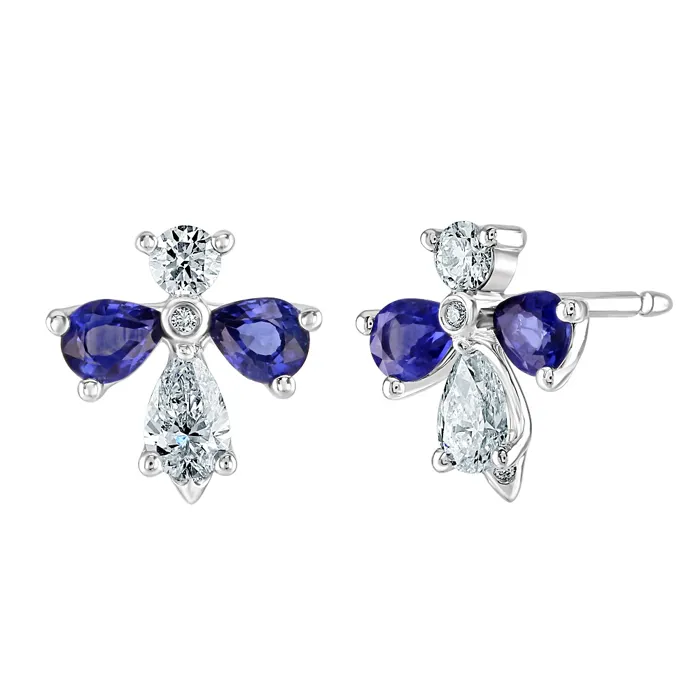 Introducing our exquisite 18ct White Gold 'Butterfly' Stud Earrings, a stunning addition to any fine jewellery collection. These meticulously crafted earrings capture the delicate beauty of butterflies, featuring a dazzling arrangement of diamonds and sapphires. The body of each butterfly is adorned with five diamonds, including pear cut and round brilliant cut stones, meticulously set in a combination of rubover and claw settings for maximum brilliance. The wings are elegantly defined by two claw-set pear cut sapphires, totalling 0.77 carats, adding a captivating splash of colour against the sparkling white of the diamonds.