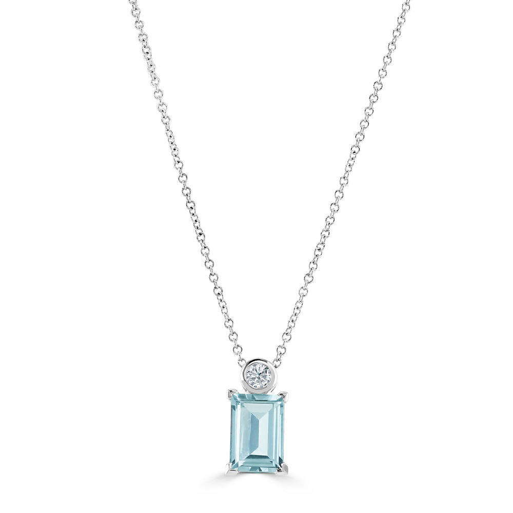 An elegant 18ct white gold pendant featuring an emerald cut aquamarine, exquisitely held in a four-claw setting. This breathtaking gemstone, weighing 0.80ct, boasts a captivating blue hue that evokes the serene beauty of the ocean's depths. Positioned above the aquamarine is a rubover set round brilliant cut diamond, adding a touch of sparkling sophistication to this exquisite piece. This pendant is beautifully presented on an 18ct white gold 17-inch trace chain, which is adjustable to 16 inches, offering versatility and comfort for the wearer. Whether you're dressing up for a special occasion or adding a touch of luxury to your everyday look, this aquamarine and diamond pendant is sure to make a statement.