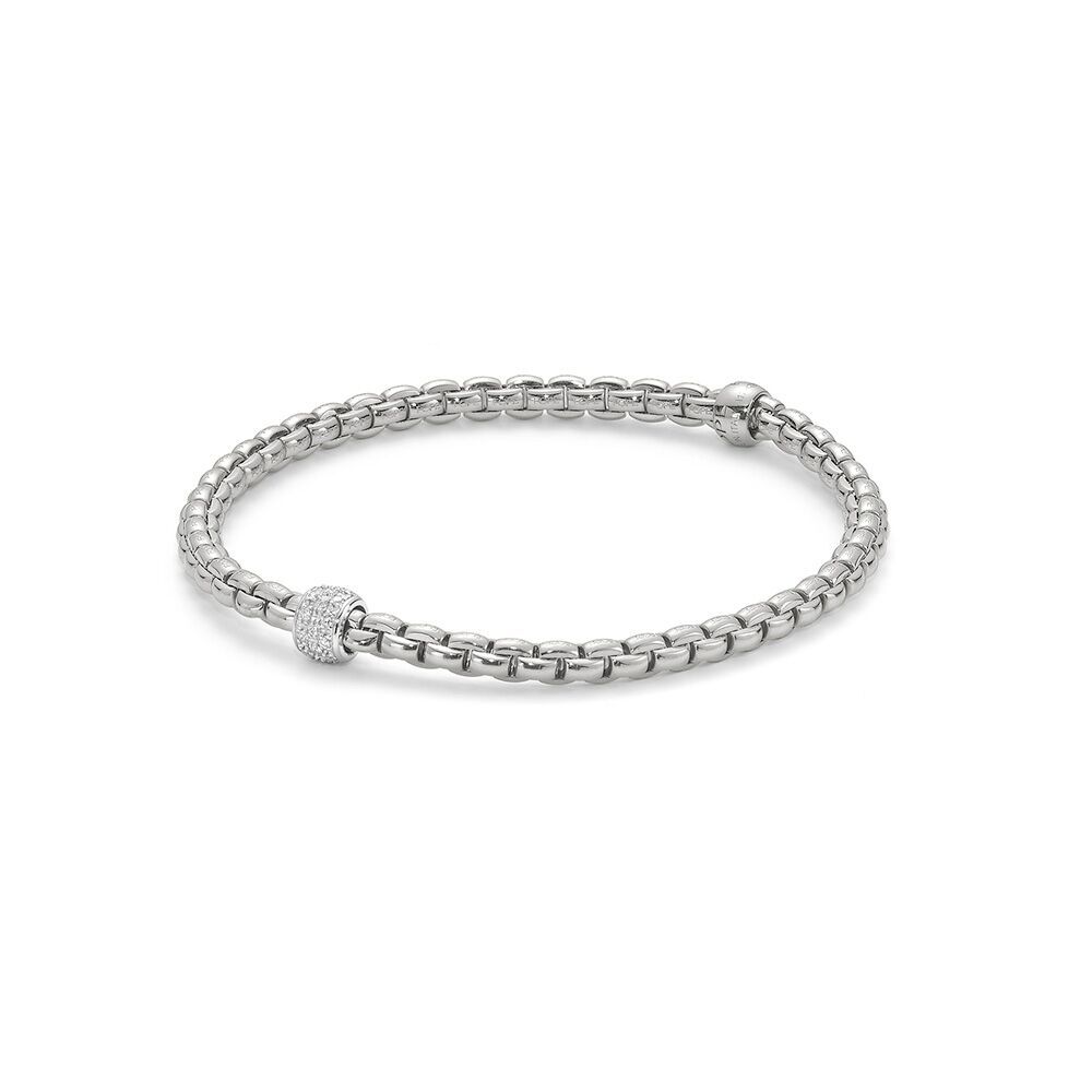 Enhance your style with the unmatched elegance of the 18ct white gold Eka flexible bracelet from Fope Gioielli. This luxurious bracelet features a single rondel, pavé-set with three lines of dazzling round brilliant cut diamonds, totalling 0.19 carats. The unique Flex'It design includes hidden springs within the links, allowing the bracelet to seamlessly form around your wrist and roll on effortlessly without the need for a clasp. Crafted in Vicenza, Italy, by the family-owned company Fope Gioielli, this piece combines traditional craftsmanship with innovative design. The bracelet's woven structure and sleek white gold composition make it a sophisticated accessory perfect for layering with other pieces from the range. Add a touch of Italian luxury to your collection with this exquisite, clasp-free bracelet, designed for both everyday elegance and special occasions