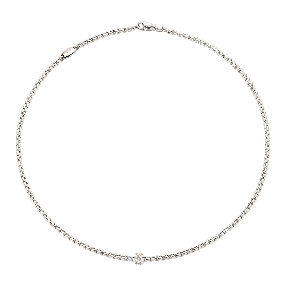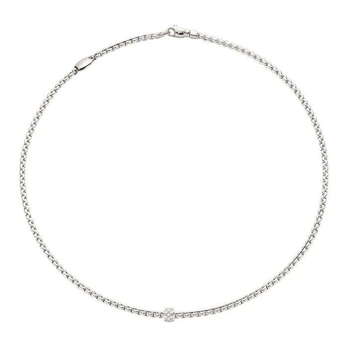 Experience the pinnacle of Italian luxury with the 18ct white gold Flex'It Eka necklace from Fope Gioielli, a stunning showcase of exquisite craftsmanship and innovative design. This elegant necklace features a unique brick link structure that provides a flexible, comfortable fit, making it perfect for daily wear. The highlight of this piece is a single white gold rondel, beautifully pavé-set with sparkling diamonds totalling 0.19 carats, adding a touch of glamour and sophistication. Measuring 50cm in length, this necklace drapes gracefully around the neck, offering a versatile look that can be dressed up or down. Perfect for those who appreciate refined style and the allure of finely set diamonds, this necklace is a standout addition to any fine jewellery collection.