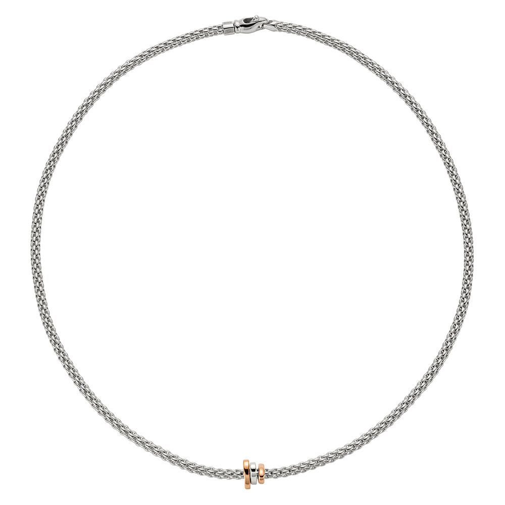 Introducing the exquisite 18ct white gold flexible necklace from the Flex'It Prima collection by Fope Gioielli, a showcase of Italian craftsmanship and innovative design. This elegant necklace measures 43cm in length and features a unique flexible structure, crafted in luxurious 18ct white gold for a seamless fit and supreme comfort. Accentuated with three distinct oval-shaped rondels in yellow, white, and rose gold, this piece beautifully combines multi-tonal elements to create a harmonious and stylish look. Ideal for adding a touch of sophistication to both day and evening wear, this versatile necklace embodies contemporary elegance and is a must-have for any jewellery lover seeking a blend of classic style and modern flair.
