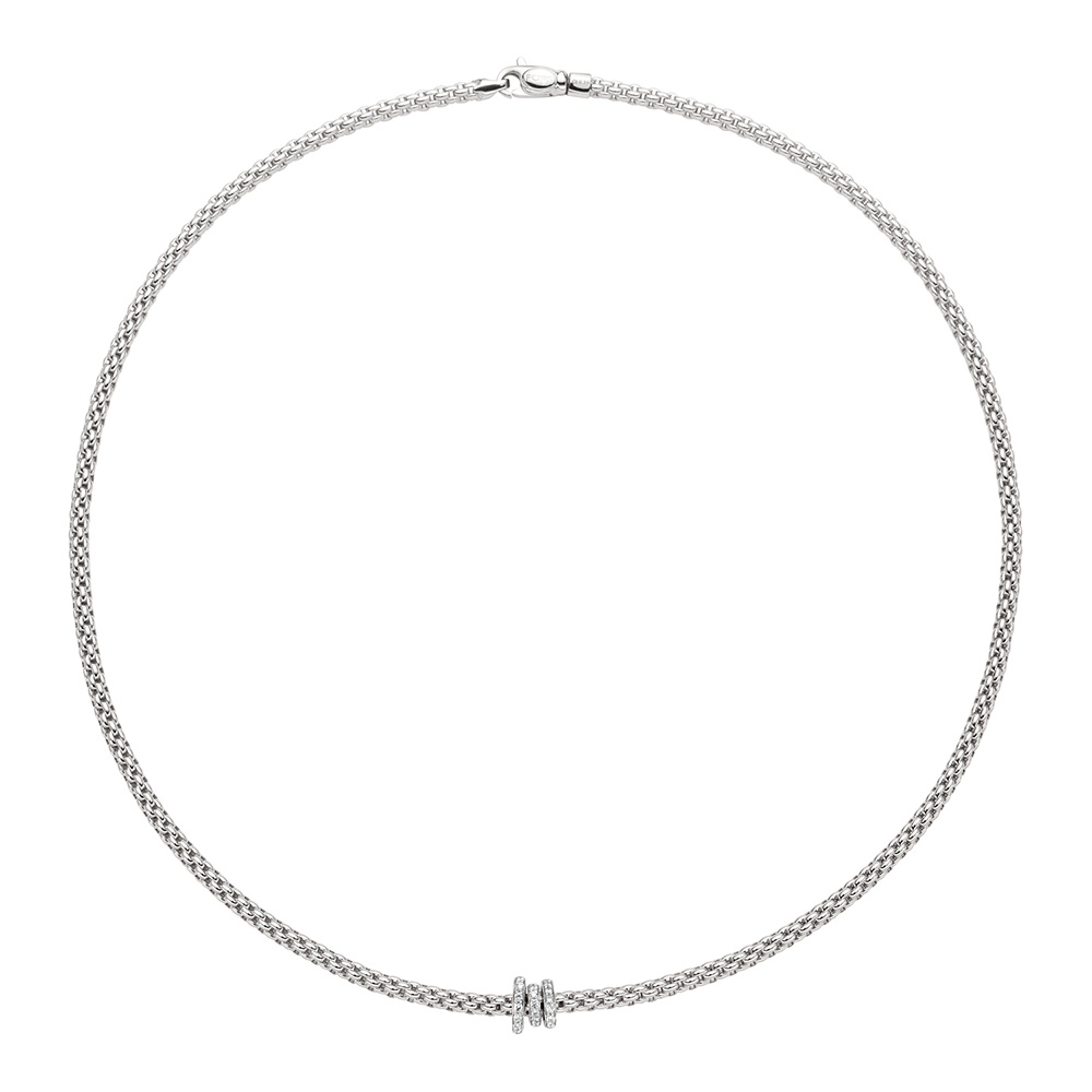 Experience unmatched elegance with our 18ct white gold flexible necklace from Fope Gioielli's renowned Flex'It Prima Collection. This sophisticated necklace showcases three oval-shaped rondels, crafted in lustrous white gold and pavé-set with dazzling round brilliant cut diamonds, totalling 0.31 carats. Each diamond is meticulously arranged to catch and reflect light, enhancing the necklace's allure and sophistication. Measuring 43cm in length, this piece drapes gracefully around the neck, its flexible design ensuring comfort and a perfect fit. Ideal for adding a touch of luxury to both day and evening wear, this exquisite necklace epitomizes Italian craftsmanship and contemporary style, making it a must-have addition to any fine jewellery collection.