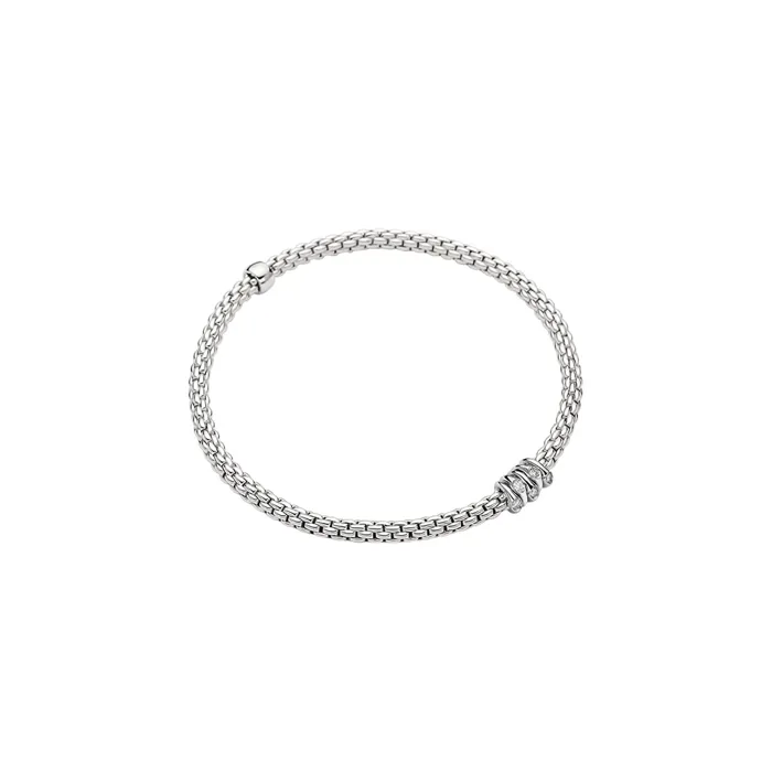 Discover the epitome of Italian luxury with our 18ct White Gold Flex'It Prima Bracelet by Fope, an exquisite blend of elegance and innovation. This stunning bracelet features five beautifully crafted diamond-set white gold rondels, adding a touch of glamour and sparkle to its sophisticated design. Constructed with 18ct gold springs hidden within the intricately woven links, this bracelet conforms gracefully to the wrist, ensuring a perfect fit without the need for a traditional clasp. The seamless design allows for effortless rolling onto the wrist, embodying both comfort and chic style. Ideal for layering with other pieces from Fope's exclusive range, this bracelet stands out as a versatile and stylish accessory. Produced by the family-owned Fope Gioielli in Vicenza, Italy, this bracelet represents a legacy of craftsmanship, designed for those who appreciate the finer things in life.