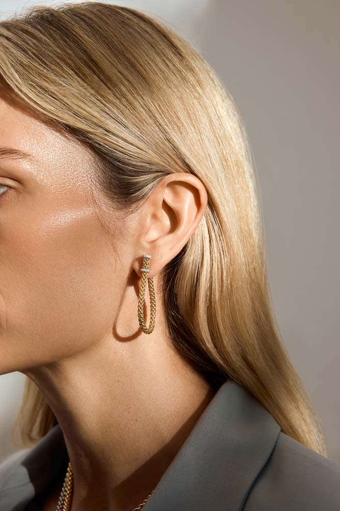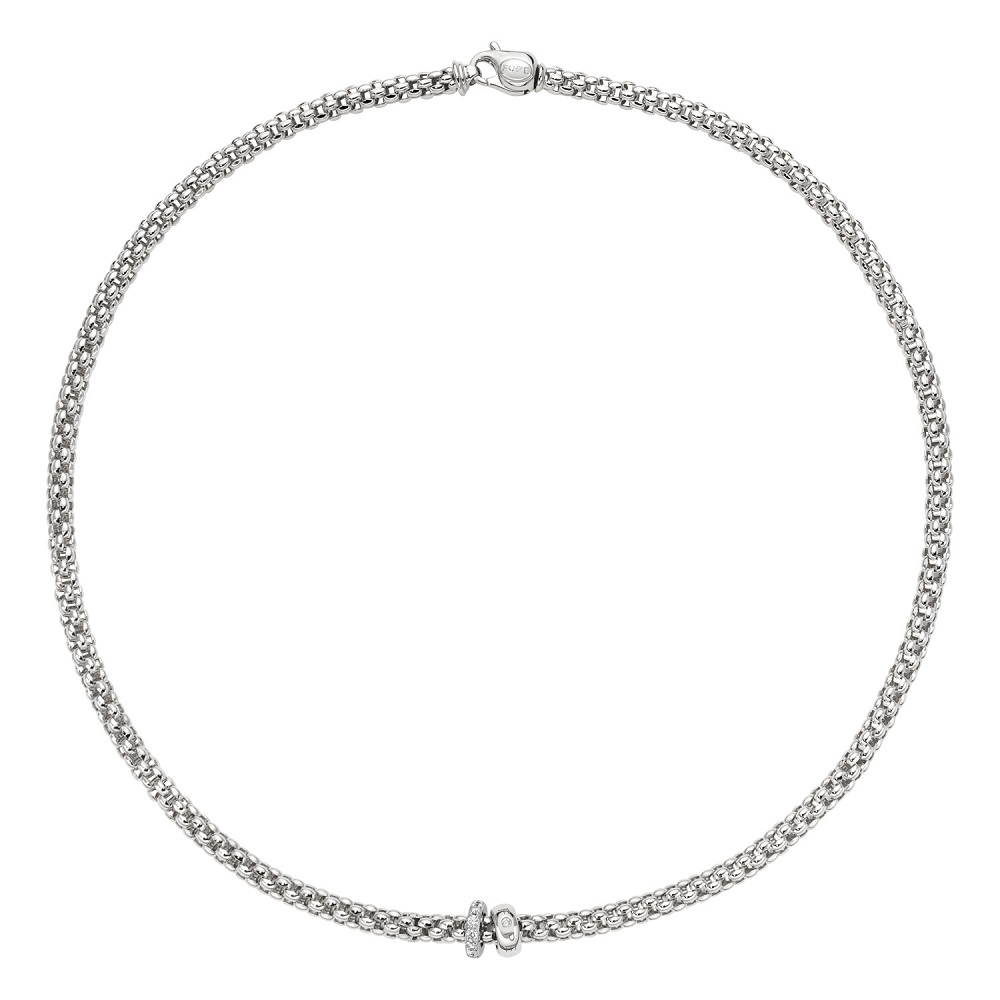 A stunning 18ct White Gold Flex'it Solo Necklace, meticulously crafted by the renowned Fope Gioielli. This exquisite piece features a sleek and innovative design, boasting two movable rondels for a touch of contemporary sophistication. One of these rondels is lavishly pavé set with round brilliant cut diamonds, adding a dazzling display of sparkle and brilliance to your neckline. With a total diamond weight of 0.29ct, this necklace combines luxury with the art of fine jewellery design.