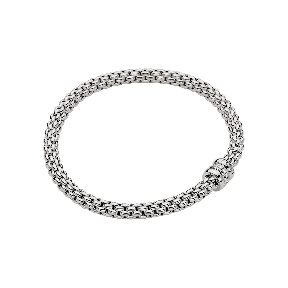 Introducing our stunning 18ct white gold Flex'It Solo flexible bracelet, expertly crafted by the renowned Italian jewellers at Fope Gioielli. This elegant bracelet combines timeless style with innovative design, featuring a flexible construction that ensures comfort and a seamless fit on any wrist. With three rondels in total, the centrepiece of this exquisite piece is a single rondel, beautifully pavé set with round brilliant cut diamonds totalling 0.10 carats. These diamonds add a luxurious sparkle that enhances the bracelet’s sleek, polished appearance. Crafted from premium 18ct white gold, this bracelet exemplifies sophistication and modern luxury, making it an ideal choice for both everyday elegance and special occasions.