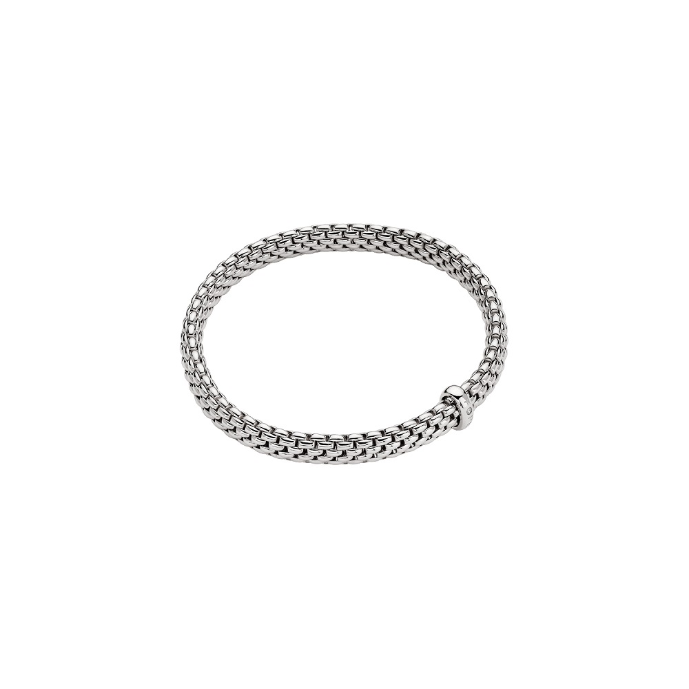Introducing the exquisite 18ct white gold flexible bracelet from the prestigious Vendôme Collection by Fope Gioielli, embodying Italian luxury with a touch of modern elegance. This bracelet features a unique flexible design, crafted in premium 18ct white gold, providing both style and comfort for everyday wear. Centred on this refined piece is a sleek rondel, elegantly set with a single round brilliant cut diamond that adds a subtle sparkle with its 0.01 carat weight. Perfect for those who value minimalist beauty, this bracelet seamlessly combines the allure of white gold with the brilliance of a diamond, making it a versatile addition to any jewellery collection. Ideal for both casual chic and formal occasions, this bracelet enhances any ensemble with its timeless charm.