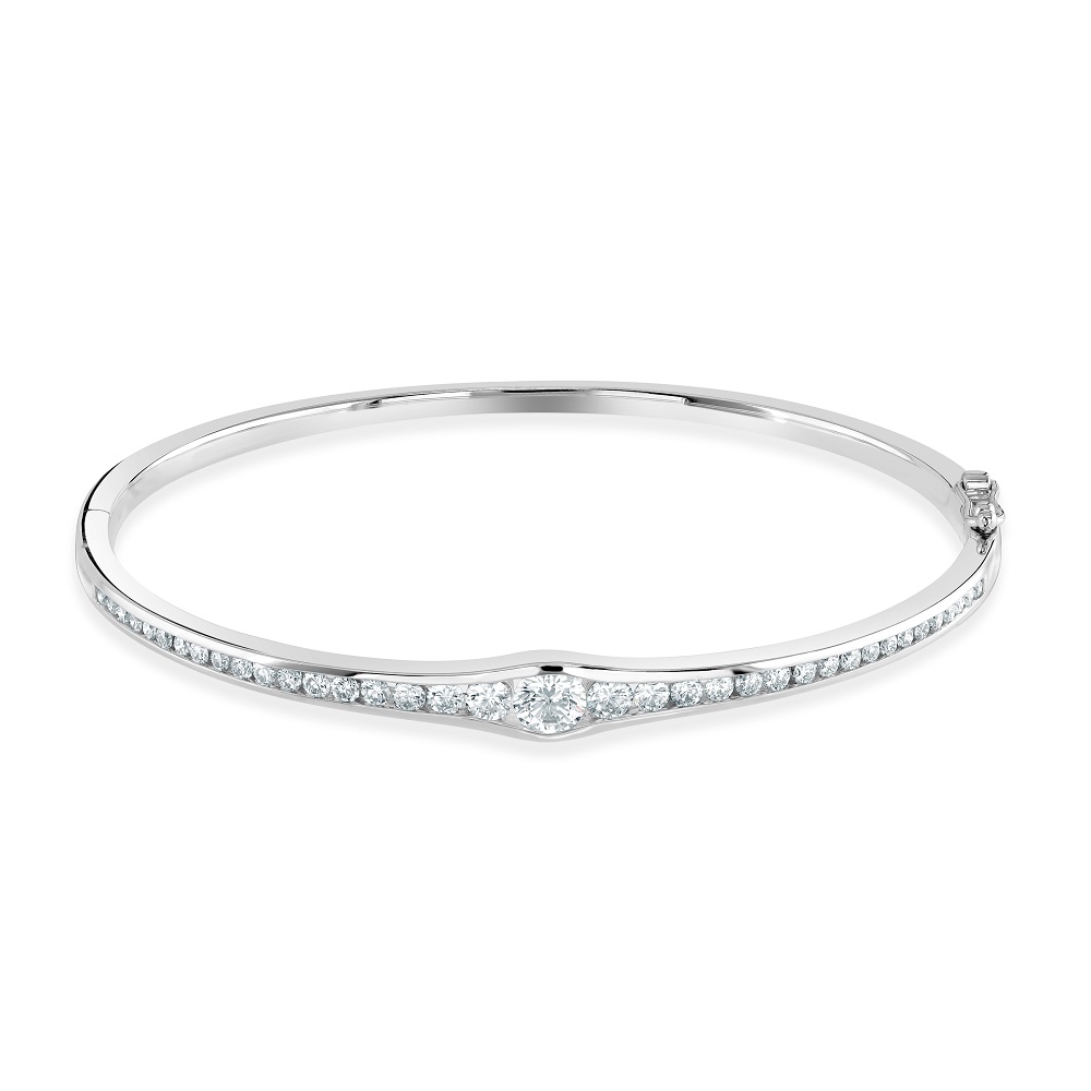 Designed with a sophisticated hinge mechanism, this bangle combines ease of wear with secure closure, making it a perfect choice for both daily elegance and special occasions. The sleek 18ct white gold setting enhances the natural beauty of the diamonds, offering a timeless piece that complements any outfit.
