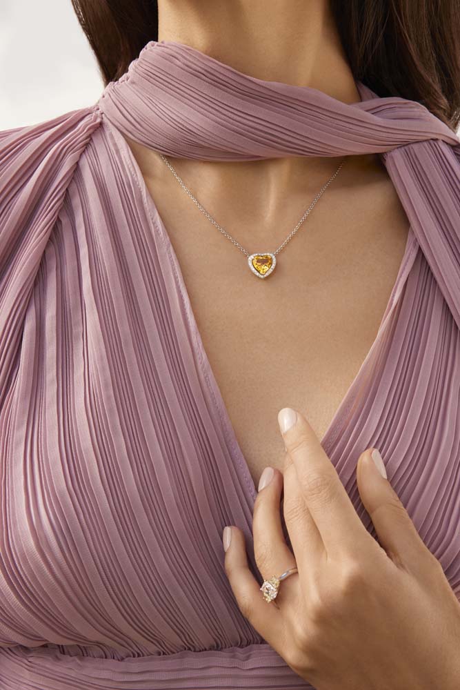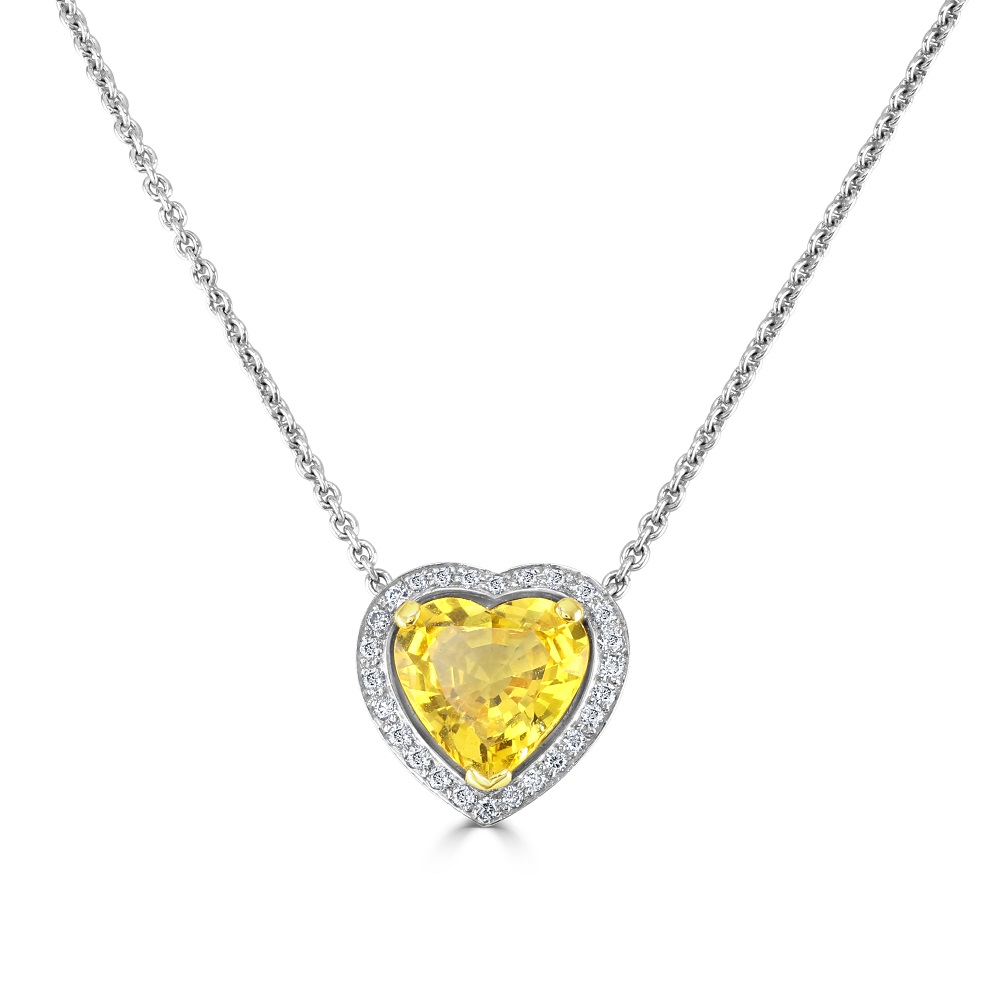 A beautiful 18ct white gold heart shaped pendant comprising of a heart shaped golden yellow sapphire encircled by sparkling round brilliant cut diamonds all suspended from a 16 inch trace chain. Other variations are available, please contact the store for more information.
