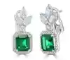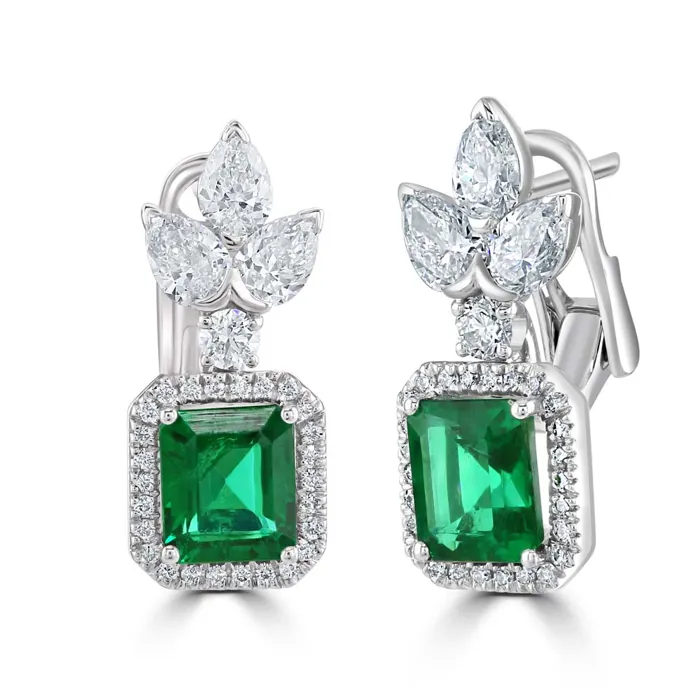 These stunning drop earrings, crafted in 18ct white gold, showcase a sophisticated and intricate design. Each earring begins with three claw-set pear cut diamonds at the top, elegantly arranged to capture, and reflect light with their brilliance. Below these diamonds, a single claw-set round brilliant cut diamond serves as a transitional element, leading the eye towards the main attraction. The centrepiece of each earring is an octagonal-shaped emerald, renowned for its rich, vibrant green hue. This emerald is beautifully framed by a halo of further round brilliant cut diamonds, adding a dazzling contrast and enhancing the emerald's deep colour. The earrings are equipped with both clip and post fittings, ensuring they remain securely in place. The combination of the lustrous diamonds, the striking emerald, and the polished white gold creates a luxurious and captivating accessory, perfect for adding a touch of elegance to any formal occasion.