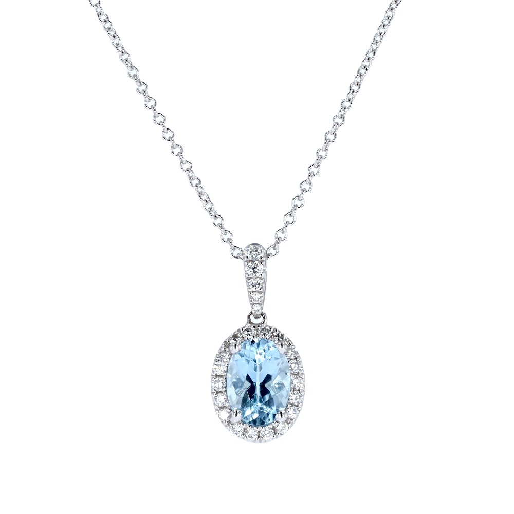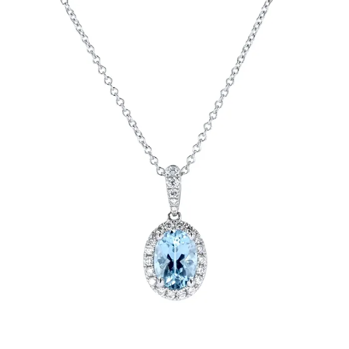 A stunning 18ct white gold pendant, a fine jewellery design that centres around an exquisite oval-shaped aquamarine. This central gemstone is securely held in place by a four-claw setting, showcasing its serene blue hue and mesmerizing clarity. Surrounding the aquamarine is a breathtaking cluster of round brilliant cut diamonds, each meticulously set to create a radiant halo that enhances the pendant's allure. Adding to the pendant's sophistication is the diamond-set bale, which not only adds an extra touch of sparkle but also seamlessly connects the pendant to the luxurious 18ct white gold chain. The chain itself is thoughtfully designed to be adjustable, offering lengths of 18 inches with options to adjust to 17 or 16 inches, ensuring the perfect fit for any neckline or occasion.