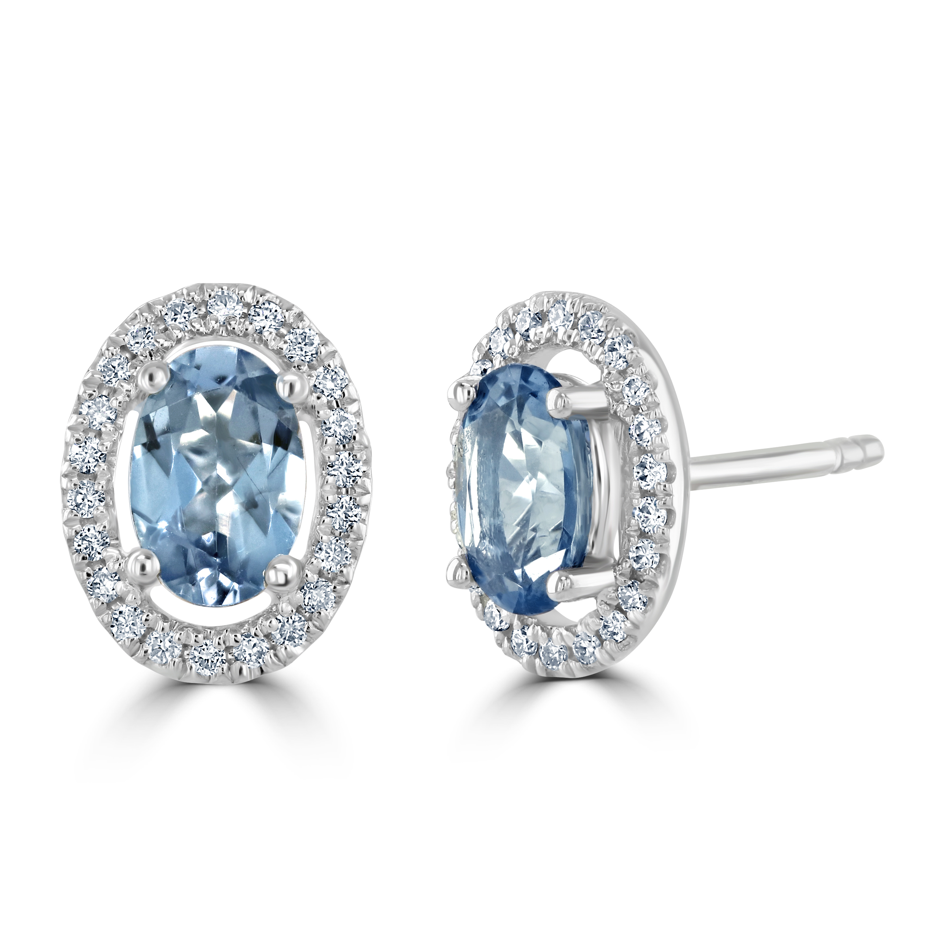 Elegant 18ct white gold stud earrings, each showcasing a mesmerizing oval cut aquamarine, cradled securely in a four claw setting. The aquamarine, with its serene blue hue and total weight of 0.86ct, serves as the centrepiece, radiating a tranquil beauty reminiscent of the ocean's depths. Surrounding each aquamarine are 22 round brilliant cut diamonds, meticulously arranged to form a radiant halo. These diamonds, with a combined total weight of 0.13cts, add a dazzling frame, enhancing the aquamarine's natural allure with their sparkling brilliance. Crafted for both comfort and style, these earrings are fitted with post and butterfly fittings, ensuring a secure and elegant adornment. Whether as a gift for a loved one or a treat for yourself, these aquamarine and diamond stud earrings are a testament to timeless beauty and exquisite craftsmanship.
