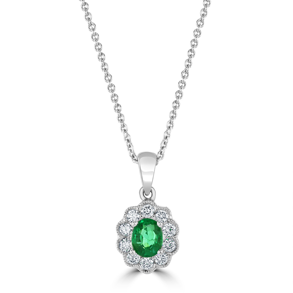 A sophisticated 18ct white gold pendant, a piece of elegance and timeless design. Centred within this exquisite piece is a captivating 0.34ct oval-cut emerald, delicately held in place by four claws, showcasing its rich green hue and vibrant clarity. This enchanting emerald is beautifully framed by ten round brilliant-cut diamonds, totalling 0.22ct, each meticulously set to enhance the pendant's radiant allure. The inclusion of a refined milgrain edge adds a touch of vintage elegance, further elevating the piece's luxurious appeal.