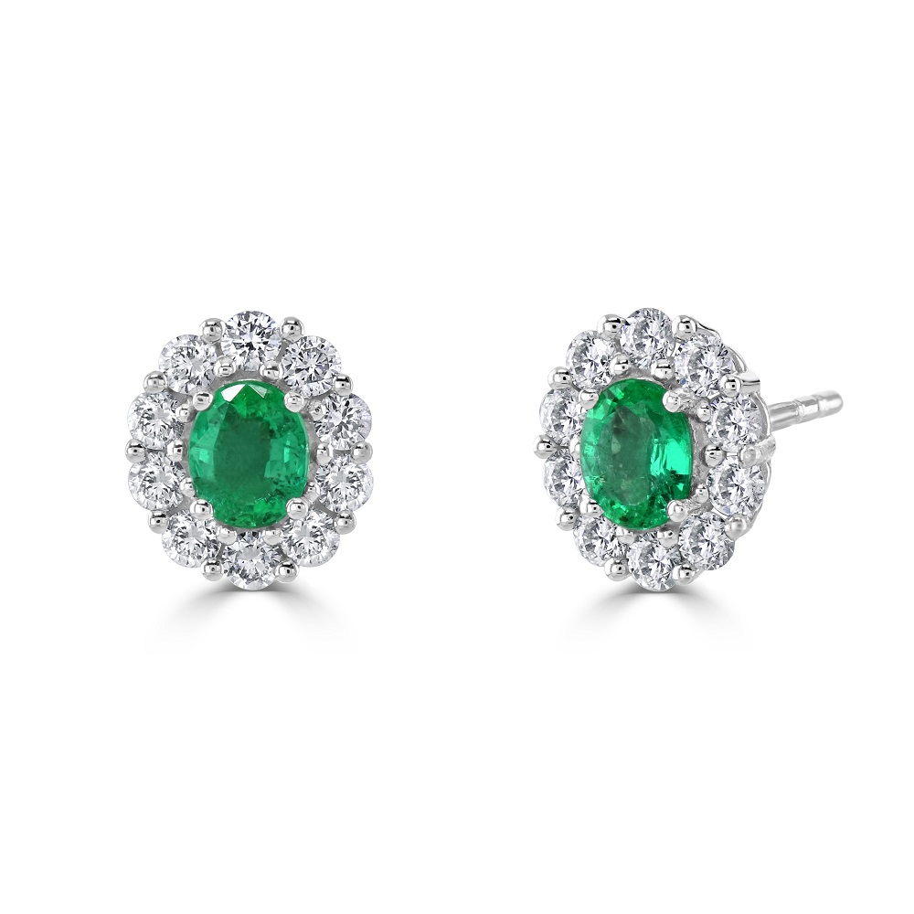 A luxurious pair of 18ct white gold stud earrings, each featuring a mesmerizing oval emerald at its heart, beautifully cradled by four sophisticated claws. These emeralds, with a total weight of 0.72ct, exude a vibrant green hue that captures the essence of nature's beauty. Encircling each emerald is a halo of ten meticulously selected round brilliant-cut diamonds, totalling 0.70ct, that amplify the allure with their radiant sparkle and unmatched clarity.
