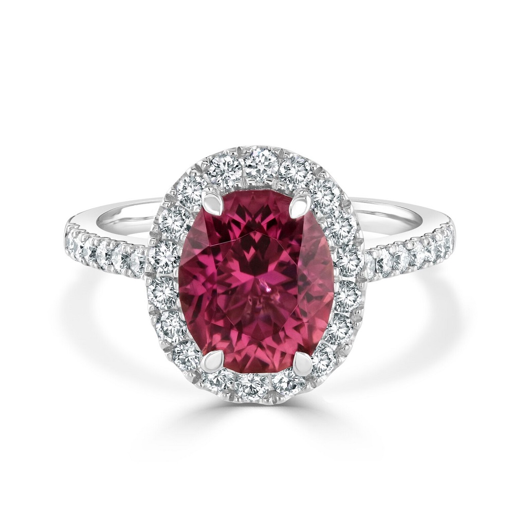 Introducing our stunning 18ct white gold halo ring, a true masterpiece that marries vivid colour with sparkling brilliance. At the centre of this exquisite ring sits a four-claw set oval-shaped pink tourmaline, weighing an impressive 2.84 carats, known for its captivating hue and depth. Surrounding the tourmaline is a halo of meticulously set round brilliant cut diamonds, enhancing the vibrant pink with their clear, radiant sparkle. Additional diamonds extend along the shoulders of the ring, bringing the total diamond weight to 0.62 carats. Crafted from luxurious 18ct white gold, this halo ring combines timeless elegance with contemporary design, making it an ideal choice for those who appreciate bold, statement jewellery. Perfect for special occasions or as a standout addition to any jewellery collection, this ring is sure to turn heads and capture hearts.