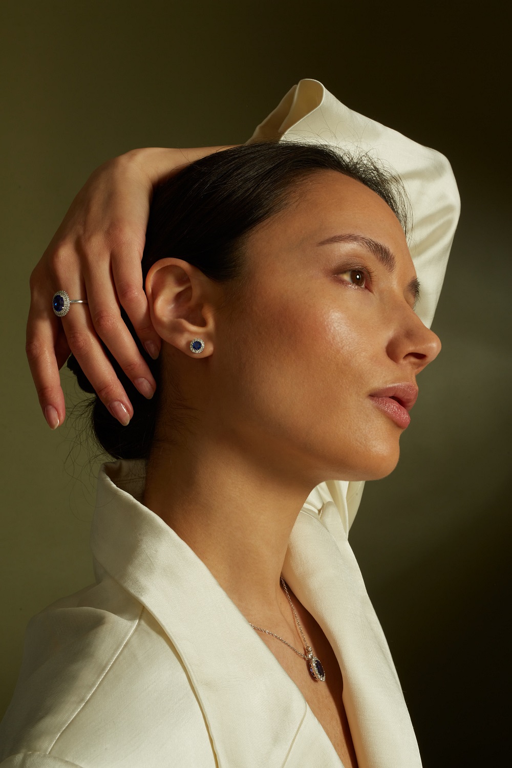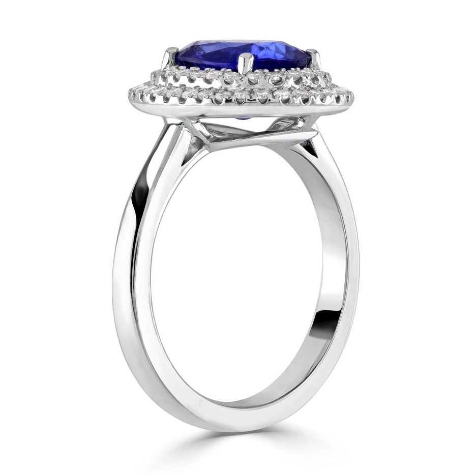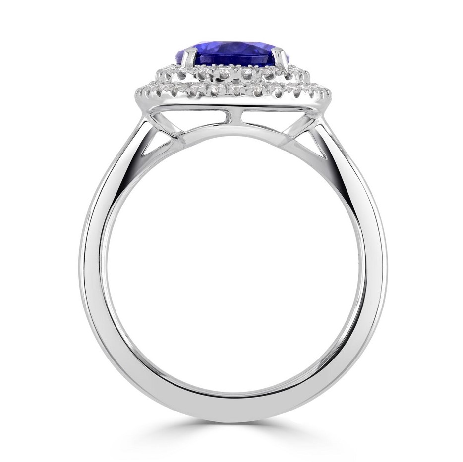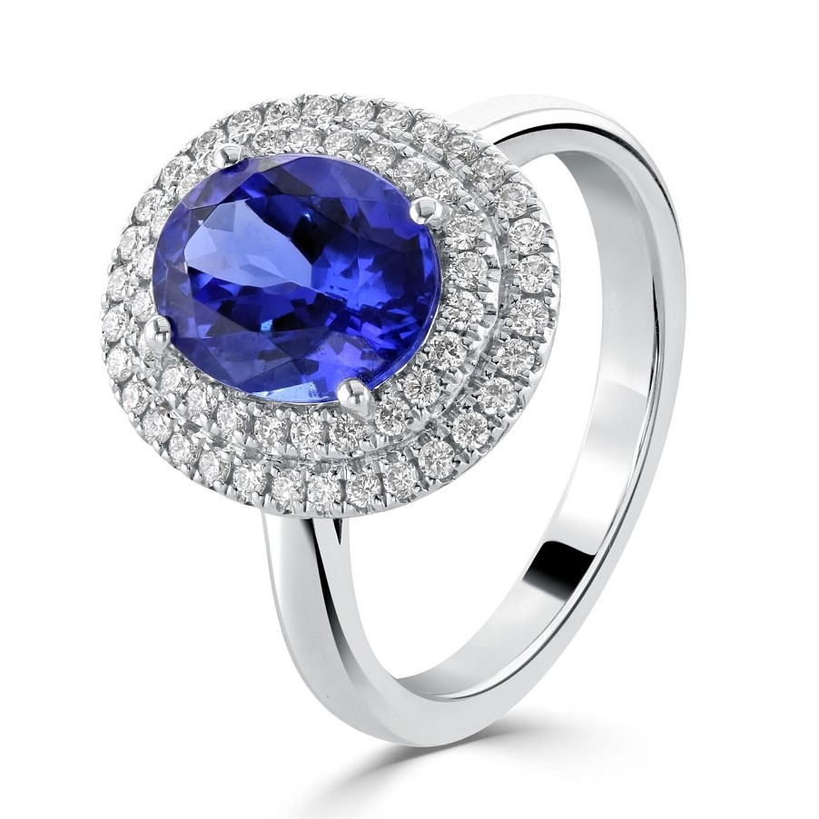 Unveil the epitome of luxury with our 18ct white gold cluster ring, featuring a mesmerizing centre oval-shaped Tanzanite, elegantly secured by a four-claw setting. This exquisite piece is further embellished with two rows of meticulously selected round brilliant cut diamonds, enhancing its majestic allure. The Tanzanite, weighing an impressive 2.82 carats, showcases a captivating play of colours, from deep blues to vibrant violets, symbolizing sophistication and rarity. Surrounding this stunning gemstone, the diamonds, with a total weight of 0.38 carats, add a breath taking sparkle that radiates from every angle. Crafted with unmatched precision and care, this ring is a testament to timeless elegance and unparalleled craftsmanship. Embrace the allure of this magnificent cluster ring, a perfect blend of beauty and brilliance, designed for those who seek to make a statement of luxury.