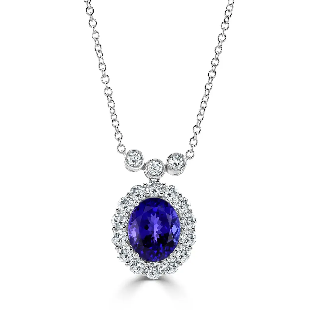A stunning pendant exuding sophistication and charm. The tanzanite is exquisitely secured with a four-claw setting at its centre. This stunning Tanzanite is encircled by 14 claw-set round brilliant cut diamonds, enhancing its vibrant blue-violet hues with an unparalleled sparkle. Adding to its allure, above the Tanzanite, three rubover set round brilliant cut diamonds gracefully descend, contributing to the pendant's luxurious appeal. The pendant is perfectly presented on an 18ct white gold 16-inch trace chain, ensuring it sits beautifully and catches the light with every movement. With a total diamond weight of 1.46ct, this piece is a symphony of brilliance and sophistication. Embrace this exquisite pendant as a statement of luxury and elegance, a perfect addition to any fine jewellery collection.