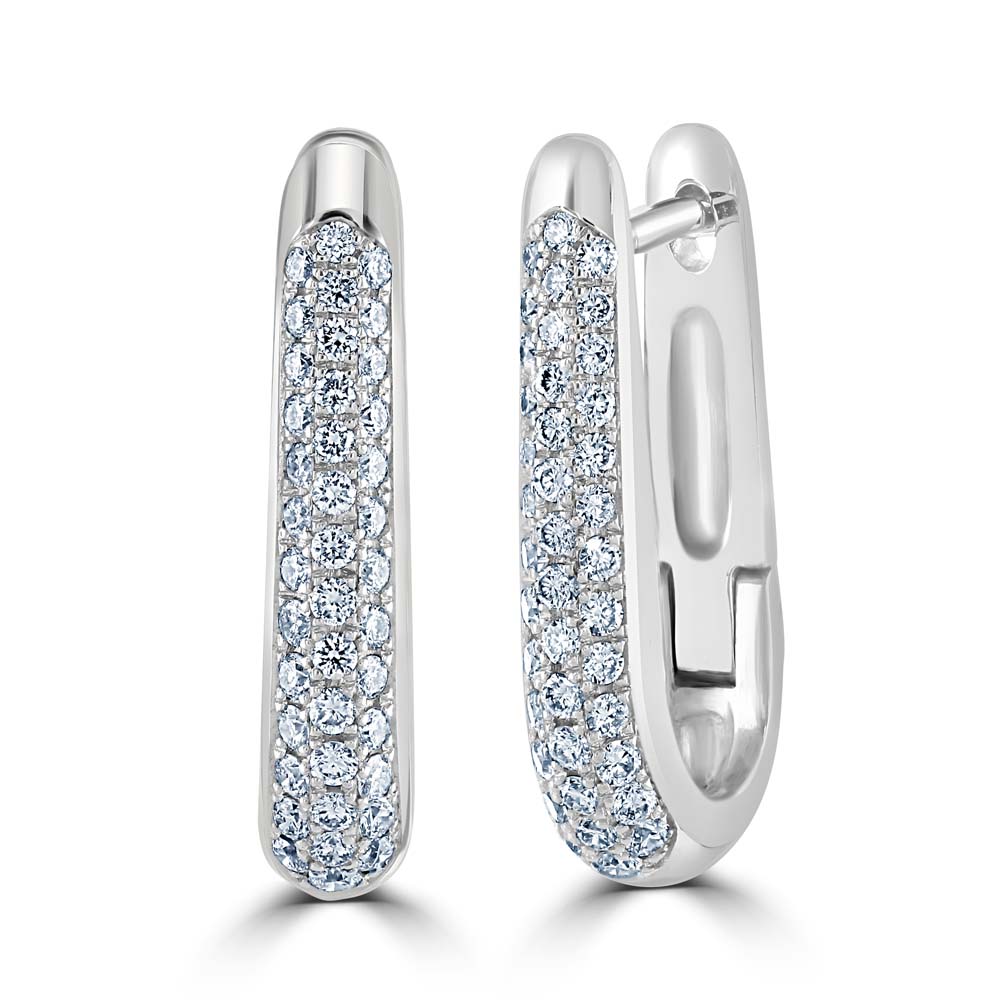 Our luxurious 18ct white gold oval hinged hoop earrings have been meticulously crafted to elevate any ensemble with a touch of glamour. Each earring dazzles with 40 round brilliant cut diamonds, pavé-set to create a continuous shimmer across the surface. These stunning earrings boast a total diamond weight of 0.62 carats, offering a radiant sparkle that enhances their elegant oval shape. Designed with a secure hinged closure for comfortable wear, these earrings are perfect for special occasions or adding a sophisticated sparkle to your everyday style. Crafted from premium 18ct white gold, these hoop earrings combine durability with a polished, sleek finish, making them a timeless addition to your jewellery collection.