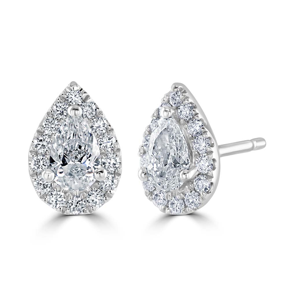 Elegant 18ct white gold stud earrings each featuring a pear cut diamond, encircled by a luminous cluster of round brilliant-cut diamonds. These exquisite earrings are designed with post and butterfly fittings for secure and comfortable wear. Perfect for those seeking to add a touch of sophistication and sparkle to their everyday look or special occasions, these stud earrings showcase the timeless beauty of diamonds set in sleek white gold. Indulge in the luxury and brilliance of our diamond cluster stud earrings, a must-have for any elegant ensemble.