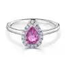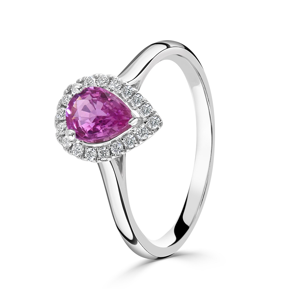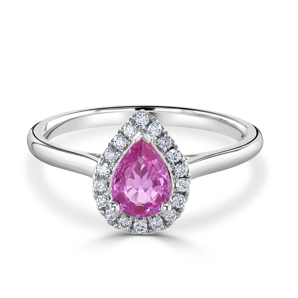 Elevate your style with our stunning 18ct white gold cluster ring, a masterpiece of fine jewellery design. This exquisite ring features a captivating pear cut pink sapphire, weighing 0.71 carats, set in a delicate three-claw setting that enhances its vibrant hue and unique silhouette. Encircling this beautiful gemstone is a halo of 18 grain-set round brilliant cut diamonds, totalling 0.11 carats, that add an extra layer of sparkle and allure.