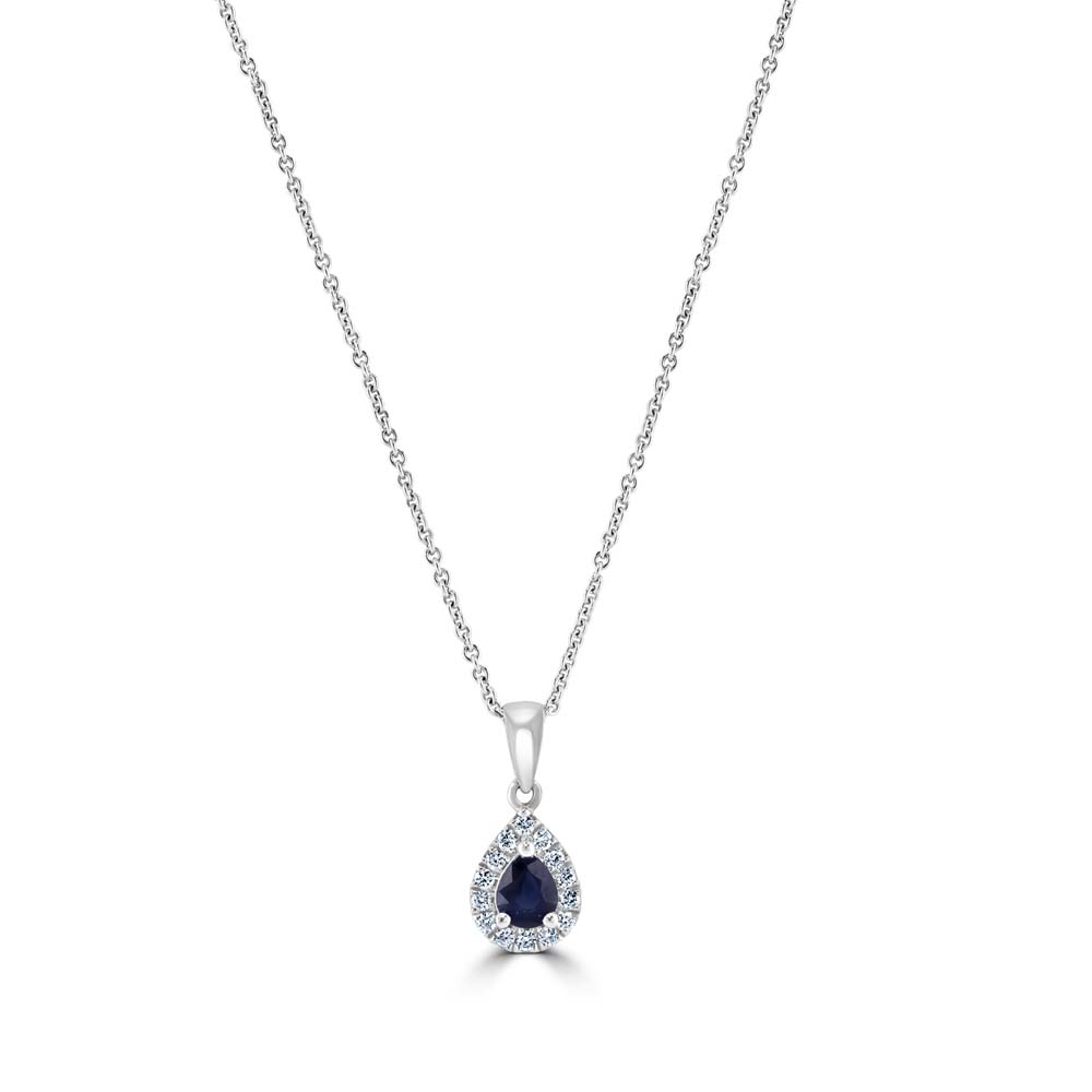 Elevate your elegance with our 18ct white gold pendant, showcasing a stunning pear cut sapphire as the centrepiece, securely set in a classic 3-claw setting. Surrounding the vibrant sapphire are 14 round brilliant cut diamonds, forming a dazzling halo that accentuates the gemstone's deep blue allure. This exquisite pendant is suspended from an 18ct white gold 18-inch anchor chain, complete with a secure lobster clasp for a perfect fit. The centrepiece sapphire weighs 0.39 carats, boasting a rich, deep blue hue that exudes timeless sophistication. Encircling the sapphire, the 14 round brilliant cut diamonds have a total weight of 0.12 carats, adding a radiant sparkle that enhances the overall brilliance of the piece. The 18ct white gold setting and chain provide a sleek and elegant backdrop, allowing the gemstones to truly shine. Crafted with exceptional attention to detail, this pendant is the epitome of refined luxury and style. Whether worn for a special occasion or as a treasured everyday accessory, this 18ct white gold sapphire and diamond pendant is a symbol of enduring beauty and elegance.