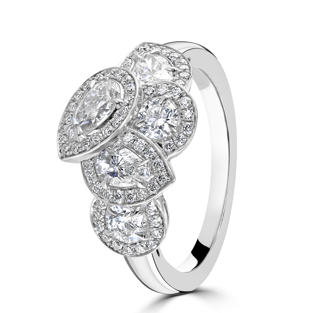 A stunning 18ct white gold asymmetrical multi-cluster ring, a masterpiece of modern elegance and sophisticated design. This exquisite ring features an artful arrangement of three pear-shaped brilliant cut diamonds and two round brilliant cut diamonds, each individually claw set to showcase their unique beauty and brilliance. These centre diamonds, with a combined weight of 1.29ct, serve as the focal point of this remarkable piece, offering a dazzling display of light and luxury.