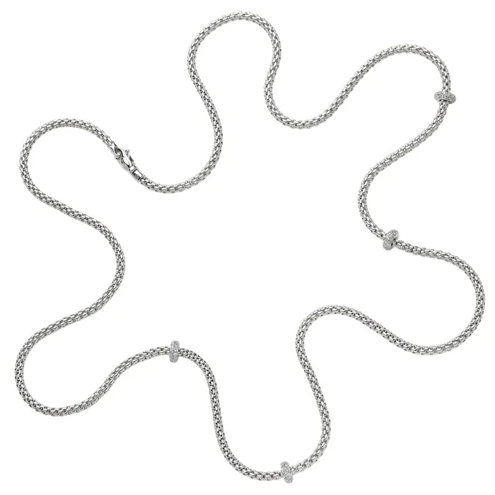 An eleganct 18ct white gold flexible necklet, a signature piece from the Prima range by Fope Gioielli. This exquisite necklet, stretching a generous 80cm in length, offers unparalleled versatility and style, seamlessly blending classic allure with contemporary design. It features four meticulously scattered diamond-set white gold rondels, each sparkling with the promise of luxury and sophistication.