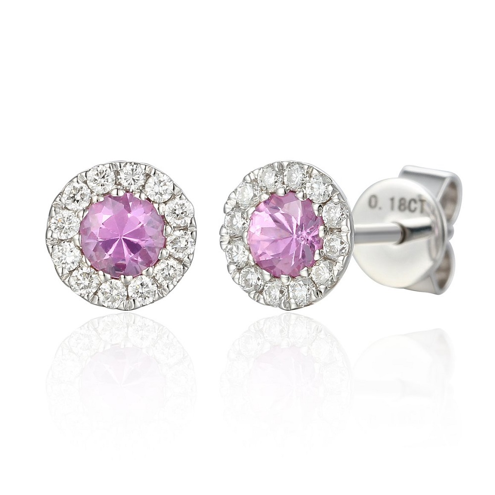 An elegant pair of 18ct white gold stud earrings, designed to bring a touch of sophistication to any attire. These exquisite earrings feature a captivating round pink sapphire at the centre, with a total weight of 0.36ct. The soft hues of the pink sapphires offer a unique and charming allure, setting these earrings apart from traditional pieces. Encircling each sapphire, twelve round brilliant cut diamonds create a dazzling halo, adding an extra layer of brilliance and luxury. The diamonds collectively weigh 0.17ct, providing a stunning contrast to the pink centrepiece and enhancing the overall sparkle of the earrings. Crafted in sleek 18ct white gold, these stud earrings merge durability with a pristine finish, making them a perfect choice for both everyday elegance and special occasions. The combination of the vibrant pink sapphire with the clear, shimmering diamonds makes these earrings a must-have for those who appreciate timeless beauty and exquisite craftsmanship. Ideal for adding a pop of colour and sophistication to your look, these stud earrings are perfect for anyone seeking a blend of modern charm and classic elegance. Whether as a thoughtful gift or a personal indulgence, these earrings are sure to be a beloved addition to any jewellery collection.