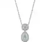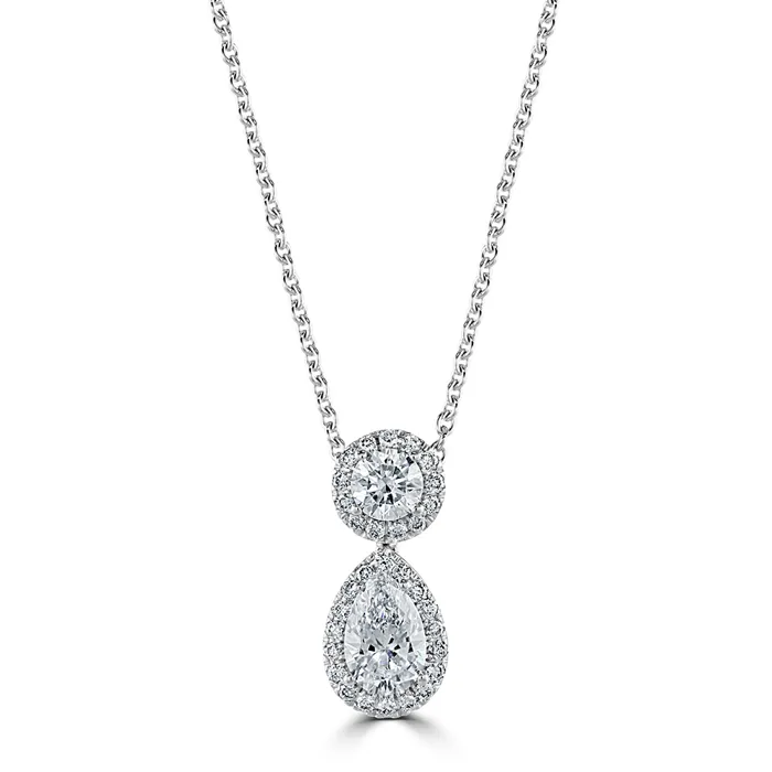 Adding to the pendant's allure is a pear-cut diamond, delicately positioned underneath the oval centrepiece, itself encircled by a captivating cluster of 31 round brilliant cut diamonds. These diamonds, with a combined weight of 0.16ct, boast a colour grade of G and clarity of VS, creating an enchanting array of sparkle that complements the pendant's overall design. The round brilliant cut diamonds that form the initial halo weigh a total of 0.24ct, with a colour grade of E and clarity of SI, adding an extra layer of luminosity.