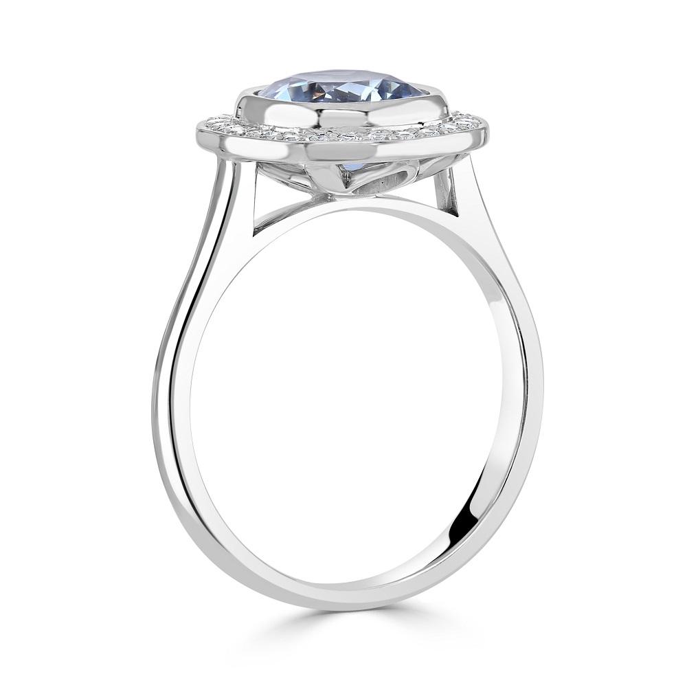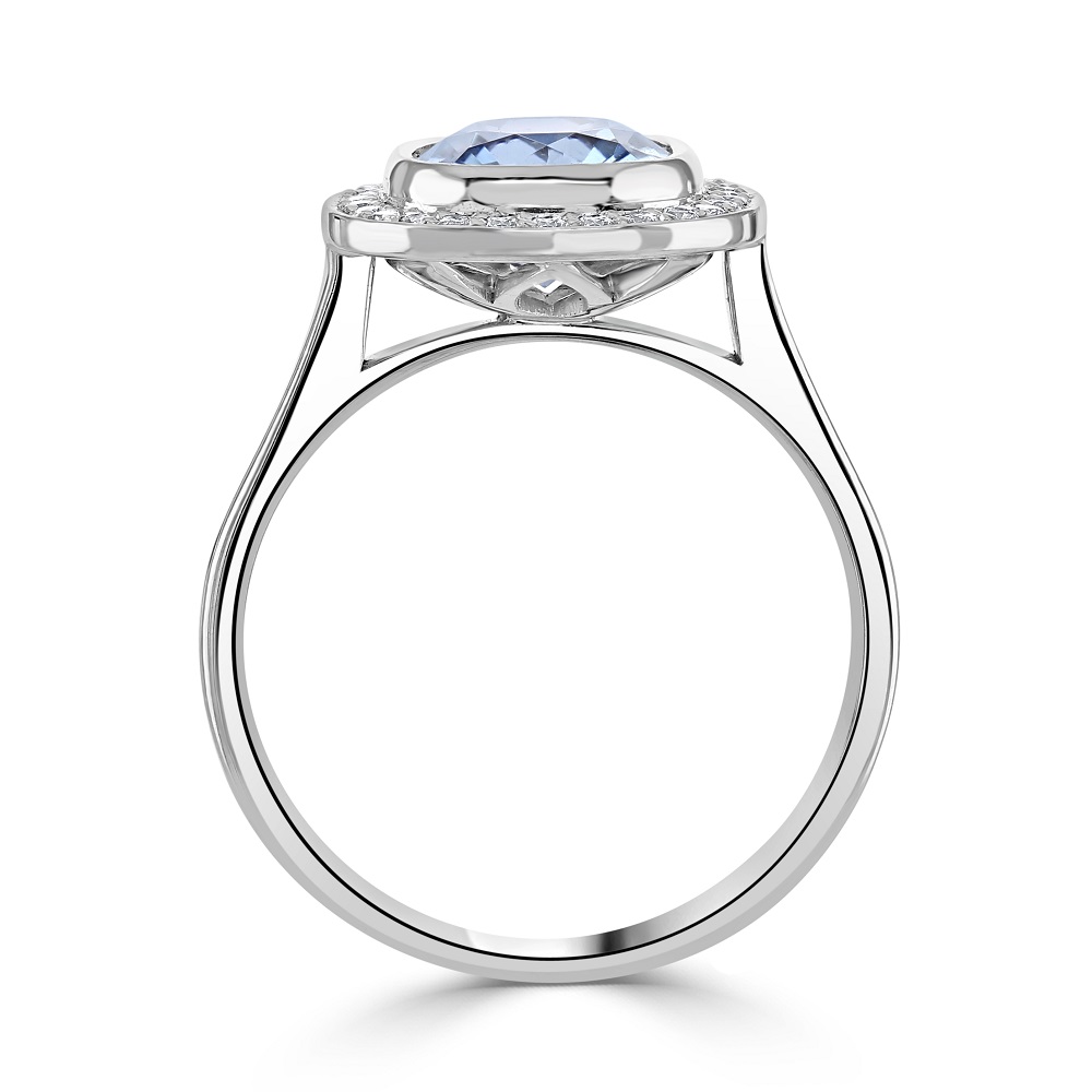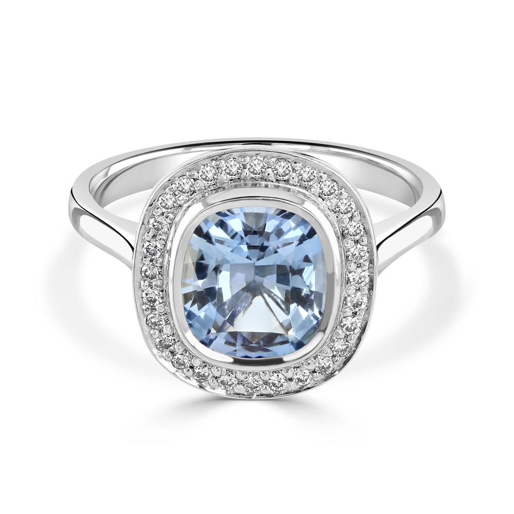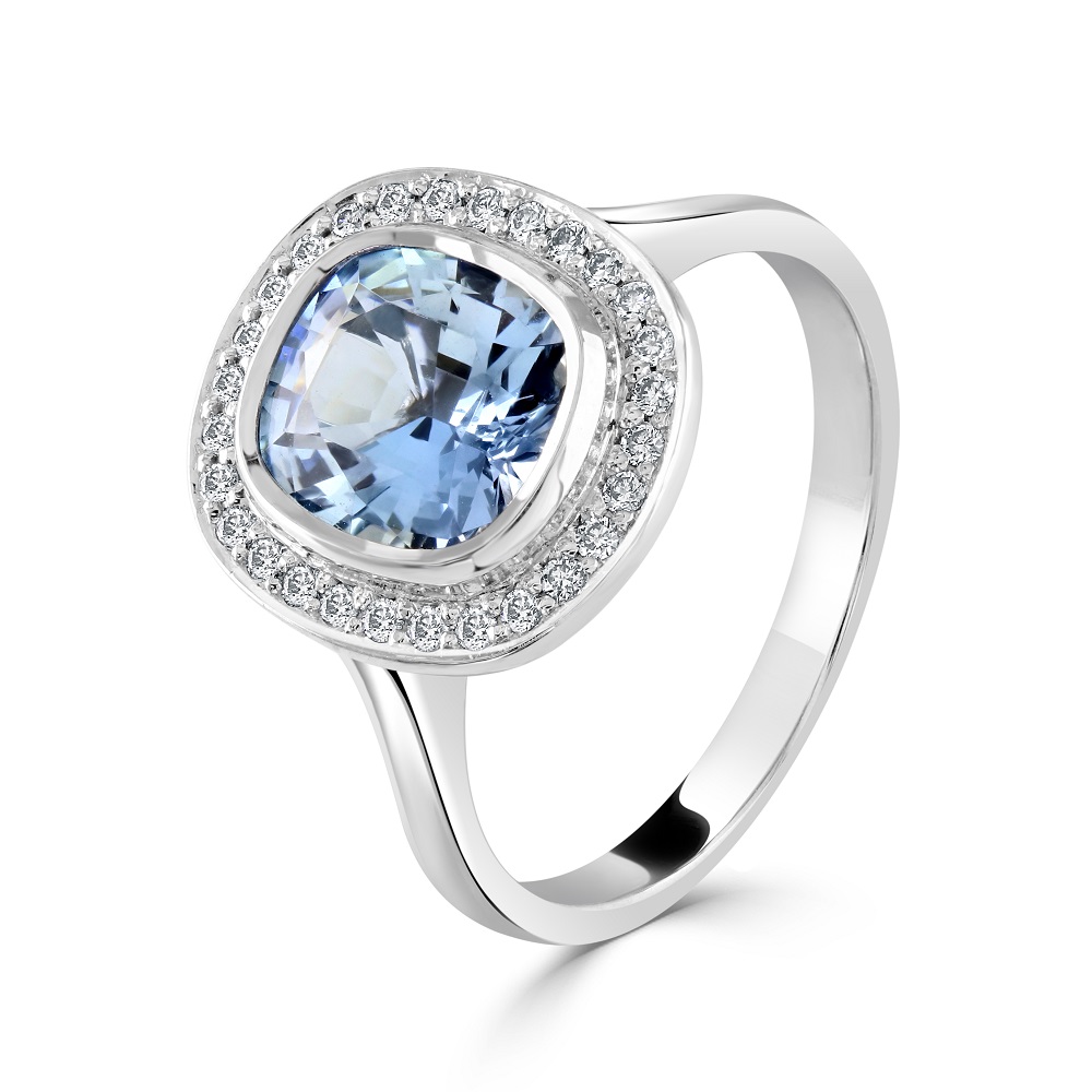 A beautiful 18ct white gold halo ring, featuring a mesmerizing centrepiece —a cushion cut aquamarine, elegantly set in a rubover setting. This stunning gemstone, with a weight of 1.64ct, radiates a tranquil blue hue, embodying both the serenity of the sea and the vastness of the sky. Surrounding this captivating aquamarine is a halo of 28 meticulously handpicked round brilliant cut diamonds that sparkle with exceptional brilliance. Whether it's an engagement, an anniversary, or a special gift, this aquamarine and diamond halo ring is a symbol of elegance and timeless beauty.