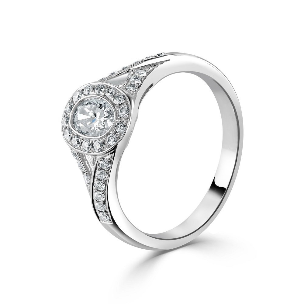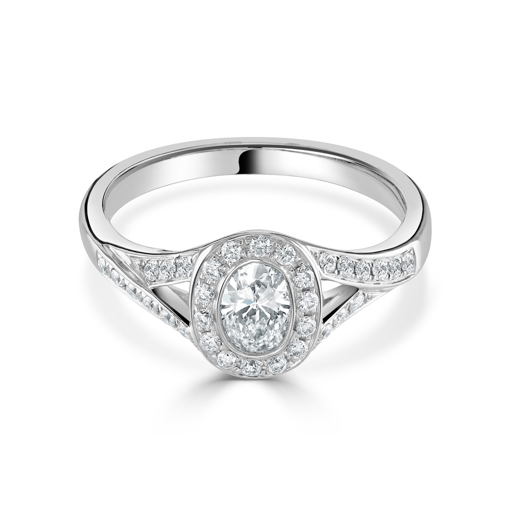 Our exquisite 18ct white gold cluster ring is a beautiful piece of luxury and craftsmanship designed to captivate and charm. At the heart of this stunning ring lies a rubover set oval cut diamond, weighing 0.44 carats, whose brilliance is enhanced by a surrounding halo of pavé set diamonds. Adding to its allure, the ring features elegant split shoulders, each adorned with additional diamonds, bringing the total weight of the surround and shoulder diamonds to 0.26 carats. Crafted from lustrous 18ct white gold, this ring combines the timeless elegance of a classic cluster setting with contemporary design elements, making it an ideal choice for engagements, special occasions, or as a significant gift. Embrace this symbol of sophistication and timeless beauty, perfect for those who appreciate intricate details and refined style.