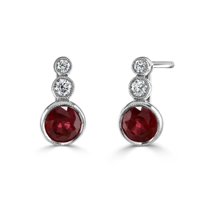 An exquisite pair of 18ct white gold drop stud earrings, meticulously designed in a vintage style to bring timeless elegance to your collection. Each earring features a graceful arrangement of two round brilliant-cut diamonds and a captivating round ruby, presented in ascending size with the largest gemstone elegantly positioned at the bottom. The gemstones, which include 0.97 carats of ruby and 0.09 carats of diamonds, are rubover set with a delicate milgrain edge, enhancing their vintage appeal. Crafted with post and butterfly fittings for secure and comfortable wear, these earrings offer a dazzling display of luxury and sophistication. Perfect for special occasions or as a glamorous gift, they are sure to enchant and impress with their classic charm and refined detail.