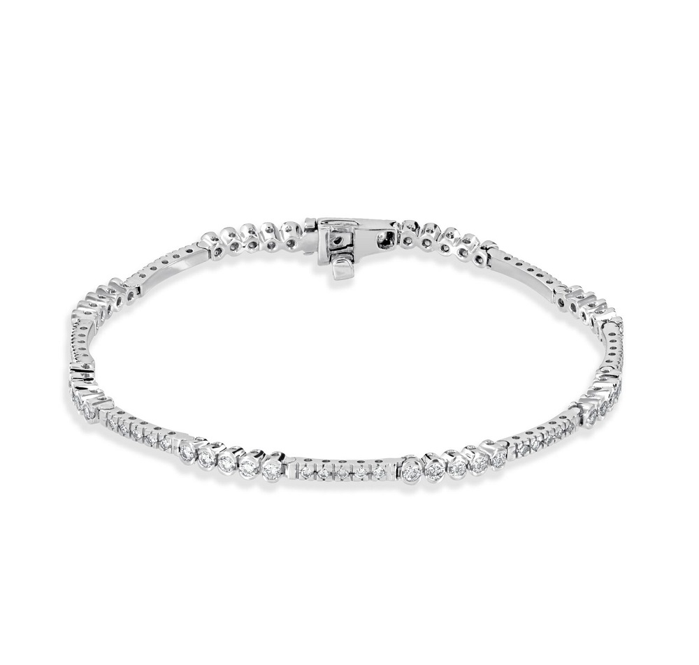 Discover the refined elegance of our 18ct white gold line bracelet, a sophisticated addition to any luxury jewellery collection. This exquisite bracelet features a unique design of 80 round brilliant cut diamonds, totalling 1.15 carats, meticulously arranged in alternating settings. Each group of five diamonds is artistically composed of both rubover and claw settings, creating a stunning pattern that enhances the diamonds' natural brilliance and sparkle. Crafted from lustrous 18ct white gold, this bracelet combines durability with a polished finish, making it perfect for both special occasions and everyday glamour. Ideal for those who appreciate a modern twist on classic styles, this line bracelet is a statement piece that captures attention and elevates any ensemble.
