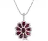 A glamourous 18ct white gold pendant, an embodiment of luxury and intricate craftsmanship. At the core of this stunning pendant lies a claw-set, round ruby, radiantly centred and weighing 2.45 carats. Encircling this central gem are nine pear drop-shaped ruby 'petals', meticulously arranged to evoke the natural beauty of a flower. This floral arrangement is beautifully highlighted by a halo of round brilliant-cut diamonds, adding an extra layer of sparkle with a total weight of 0.40 carats. The pendant is further enhanced by a diamond-set bale, ensuring every angle glistens with elegance. Suspended on an 18-inch Spiga chain, adjustable to 16 inches for versatile styling, this pendant is a testament to timeless design and perfect for any occasion that calls for a touch of glamour.
