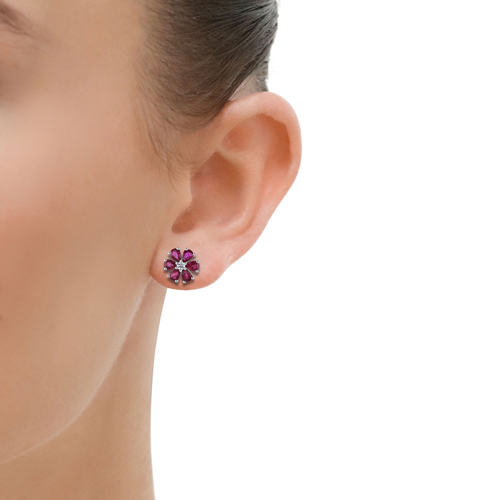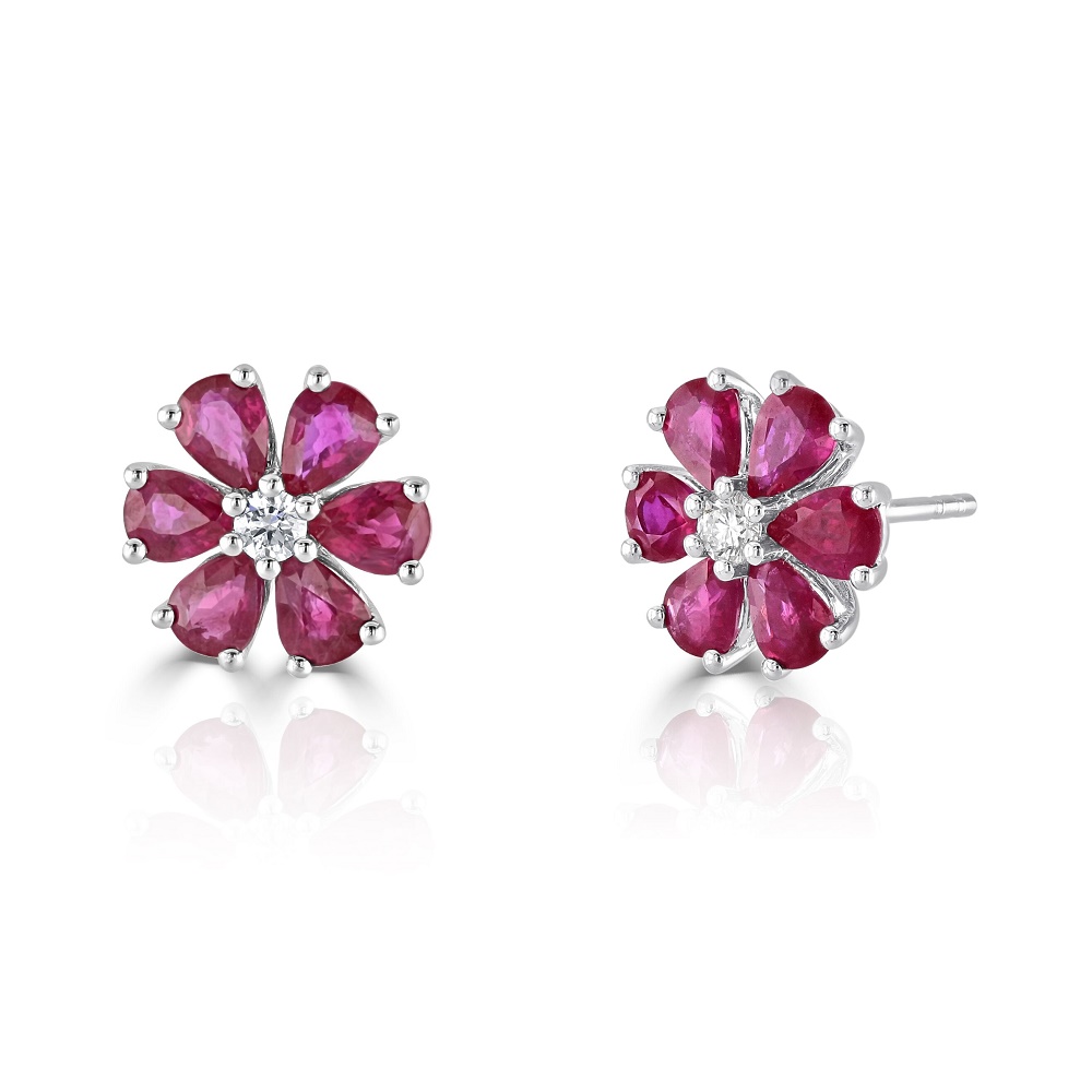 Introducing our stunning 18ct white gold flower shaped stud earrings, a true embodiment of floral elegance and sophisticated design. At the centre of each earring, a single round brilliant-cut diamond, totalling 0.10 carats, is delicately claw-set, radiating a sparkling brilliance. This central diamond is beautifully surrounded by six claw-set pear-shaped rubies, each meticulously arranged to mimic the petals of a blooming flower. With a total ruby weight of 2.28 carats, these rubies display a rich, vibrant red that adds a dramatic pop of colour to the design. Crafted from lustrous 18ct white gold, these earrings offer a timeless appeal with a contemporary twist, making them perfect for any occasion, from casual outings to more formal events. Whether as a gift or a treat for yourself, these flower-shaped stud earrings are sure to captivate and charm with their exquisite beauty and craftsmanship.