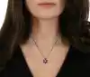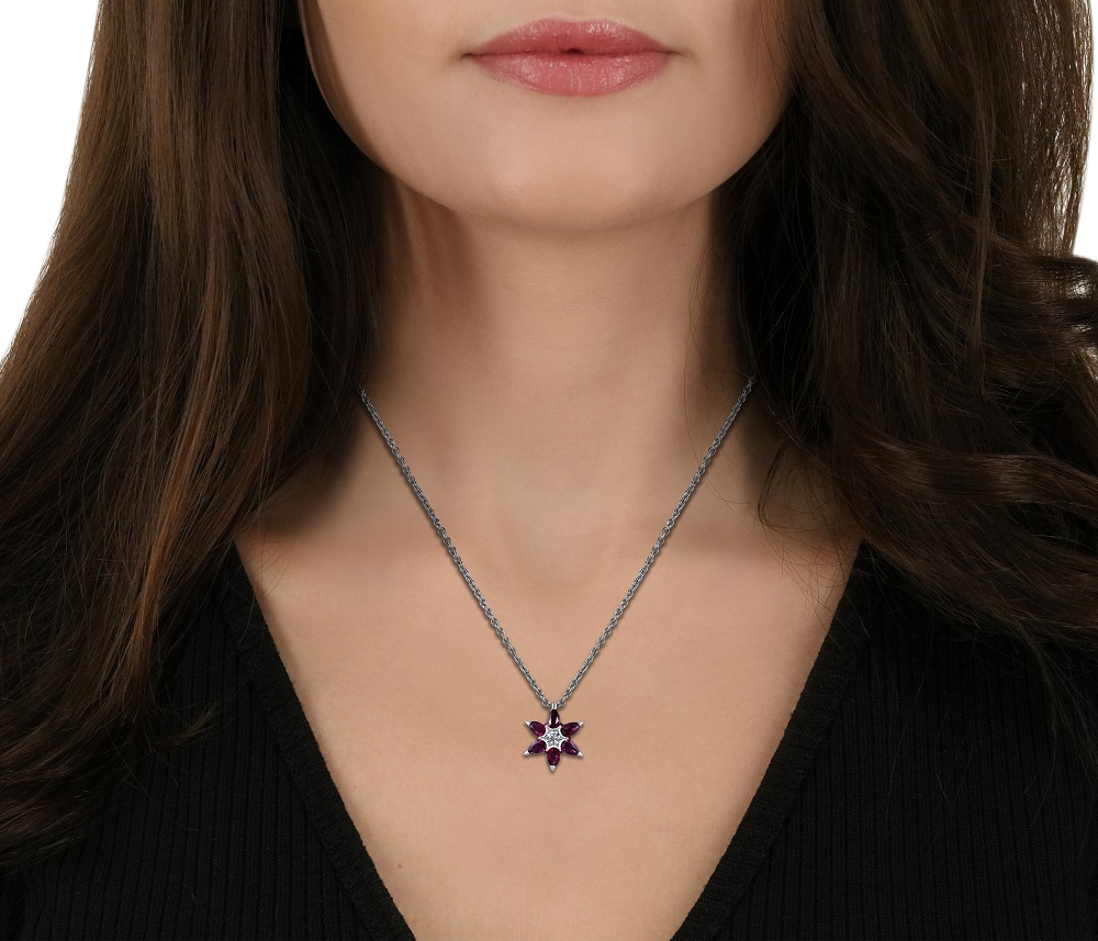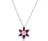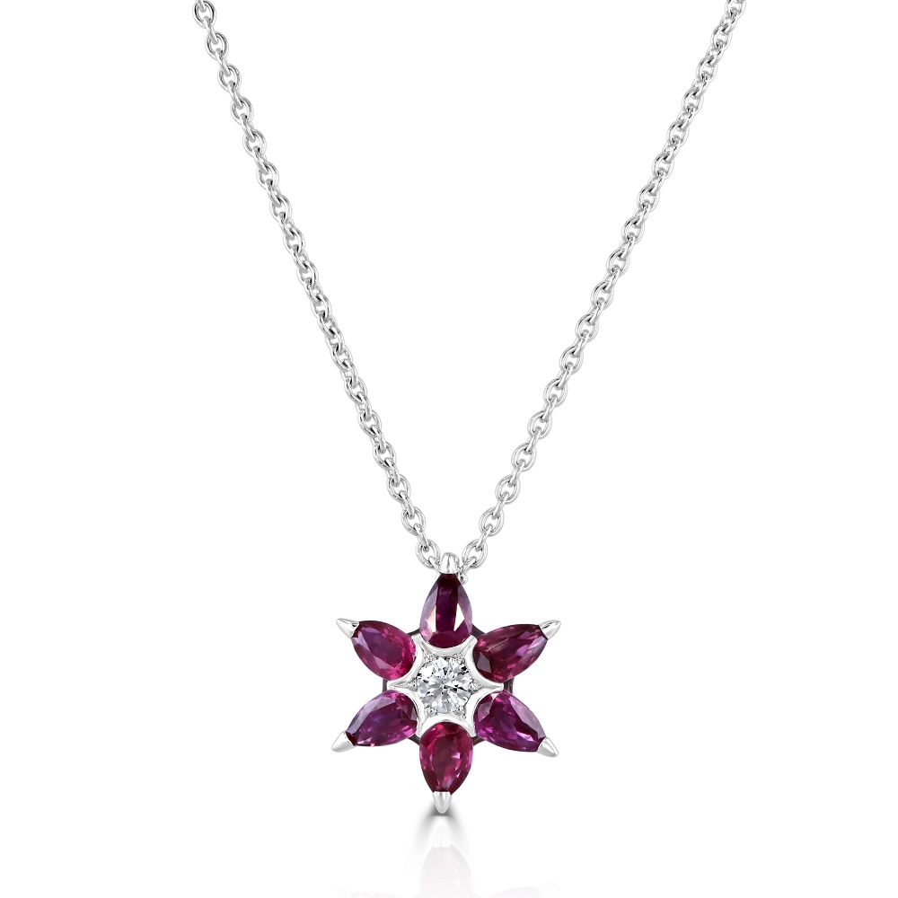 Unveil the delicate charm of our 18ct white gold flower shaped pendant, a masterpiece of fine jewellery design that blossoms with elegance. At the centre of this floral pendant lies a small, claw-set round brilliant-cut diamond weighing 0.08 carats, boasting a G color and SI clarity that sparkles with pure brilliance. This central gem is beautifully surrounded by six pear-shaped rubies, totalling 1.10 carats, arranged to mimic the natural grace of flower petals. Each ruby radiates a deep, vivid red, creating a stunning contrast against the sleek 18ct white gold setting. The pendant is gracefully suspended on a 17-inch trace chain, also crafted in 18ct white gold, ensuring it lays perfectly on the neckline to enhance any outfit. Ideal for special occasions or as a gift to symbolize growth and new beginnings, this pendant is a timeless choice for anyone who appreciates the beauty of nature and the art of fine craftsmanship.