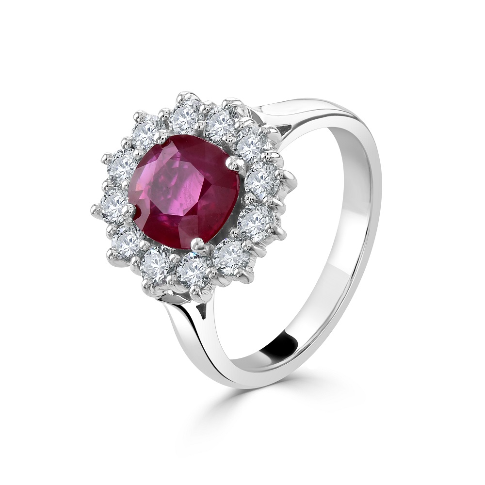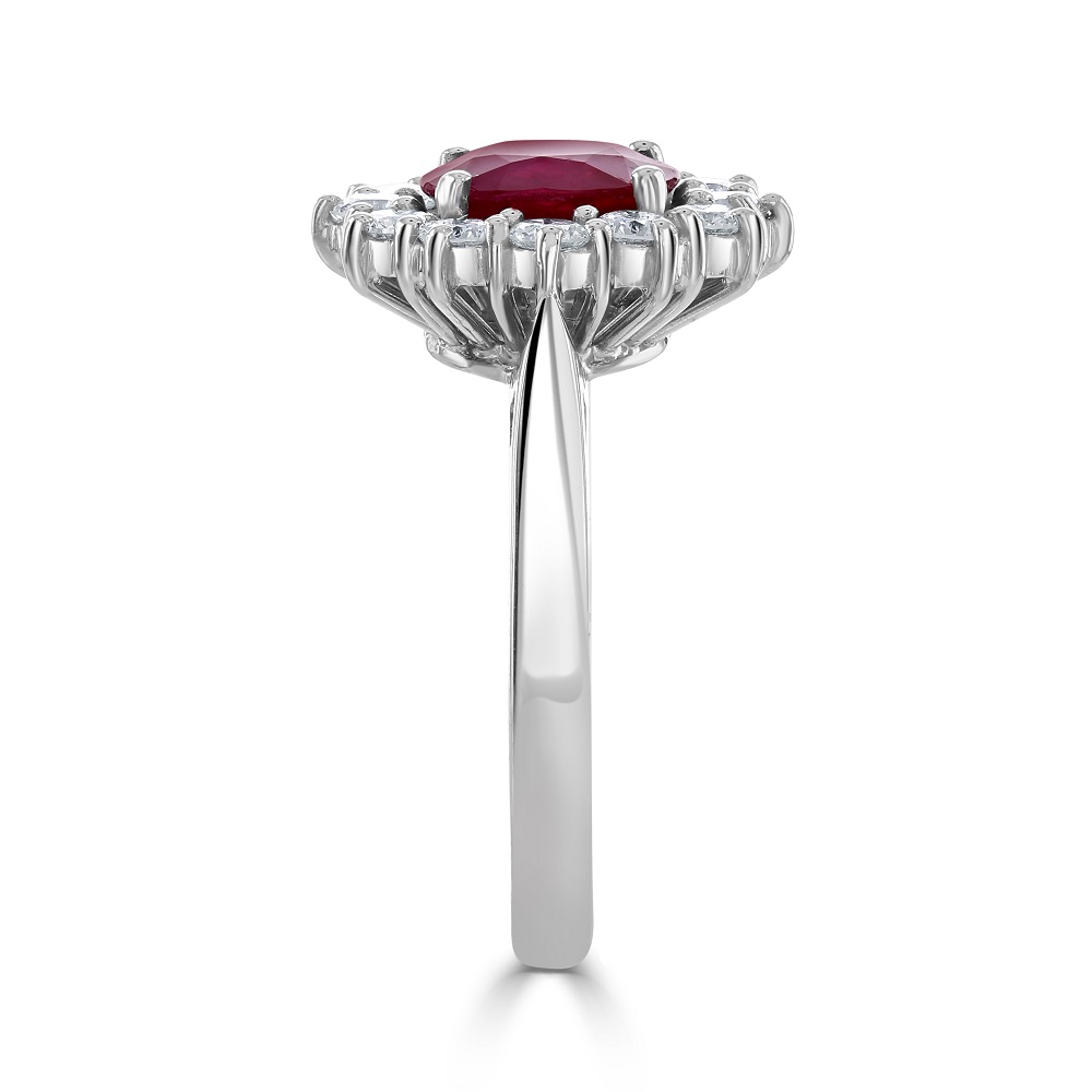 A stunning 18ct white gold oval ruby and diamond cluster ring, a masterpiece of elegance and timeless design. At the heart of this exquisite ring sits a captivating 1.65ct oval ruby, its deep, vibrant red hue symbolizing passion and luxury. Surrounding this magnificent centrepiece, twelve meticulously claw-set diamonds totalling 0.86ct encircle the ruby in a dazzling display of brilliance, creating a breathtaking halo effect.