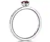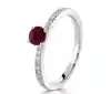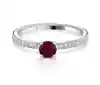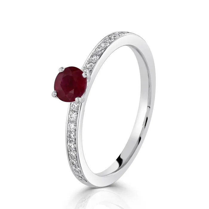 An elegant 18ct white gold ring, featuring a stunning central round ruby weighing 0.45 carats, beautifully secured by a four-claw setting. This striking ruby is complemented by ten sparkling round brilliant cut diamonds delicately positioned on each shoulder, collectively weighing 0.16 carats. The design of this ring balances classic charm with a touch of contemporary grace, making it a perfect choice for engagements, anniversaries, or as a significant gift. Its sophisticated craftsmanship ensures it stands out as a luxurious addition to any jewellery collection, offering a blend of timeless beauty and modern flair.