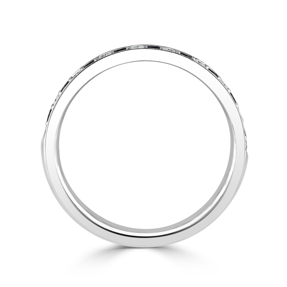 Our refined 18ct white gold eternity ring is beautifully crafted to symbolize everlasting elegance. This sophisticated ring is micro claw set with an alternating pattern of nine round sapphires and ten round brilliant cut diamonds, creating a seamless flow of colour and sparkle around the band.