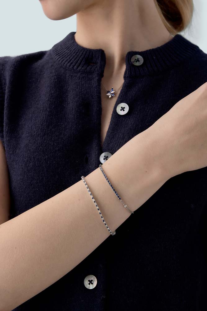 Enhancing the bracelet’s design, one rubover set round brilliant cut diamond is intricately inserted into the chain on each side. These diamonds, with a combined weight of 0.06ct, provide a subtle yet captivating sparkle that complements the vibrant sapphires.