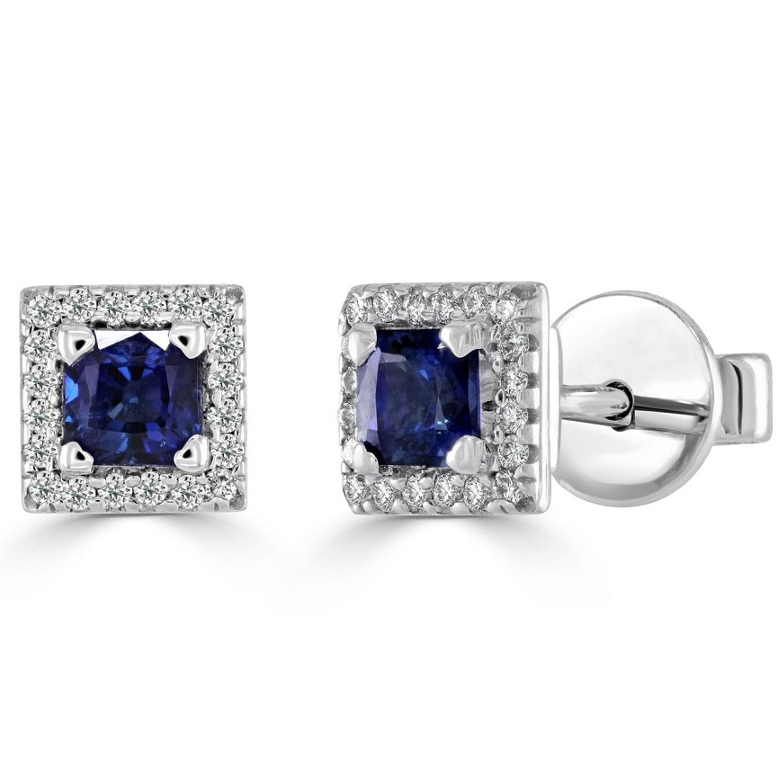 Elevate your style with our luxurious 18ct white gold halo stud earrings, each featuring a stunning square sapphire at the centre, securely held by a claw setting. These striking sapphires, totalling 0.76 carats, are beautifully framed by a halo of grain-set round brilliant cut diamonds, which collectively weigh 0.20 carats, adding an exquisite sparkle that highlights the deep blue of the sapphires.