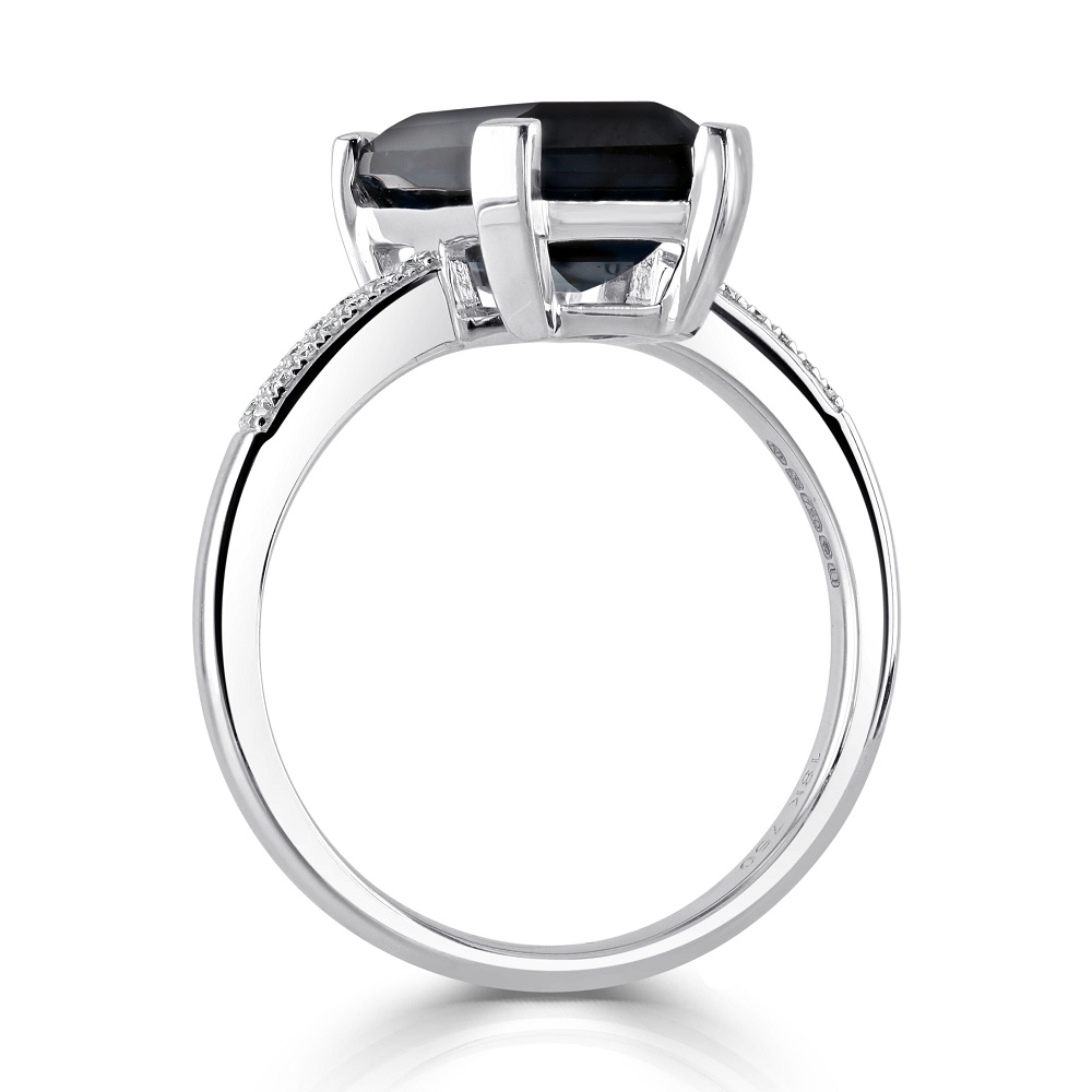 An enchanting 18ct white gold ring, meticulously crafted with a stunning 4.64ct London blue topaz. This exquisite ring features a unique, long octagonal cut blue topaz, securely held in place by four elegant claws, ensuring both brilliance and durability. The vibrant deep blue hue of the topaz makes a striking statement, perfect for those who seek a touch of sophistication and luxury. Complementing the central gemstone, the ring's shoulders are beautifully pavé-set with 14 round brilliant cut diamonds, totalling 0.08ct. These carefully selected diamonds add a subtle sparkle that enhances the mesmerizing blue of the topaz, making it a perfect choice for special occasions or as a memorable gift.